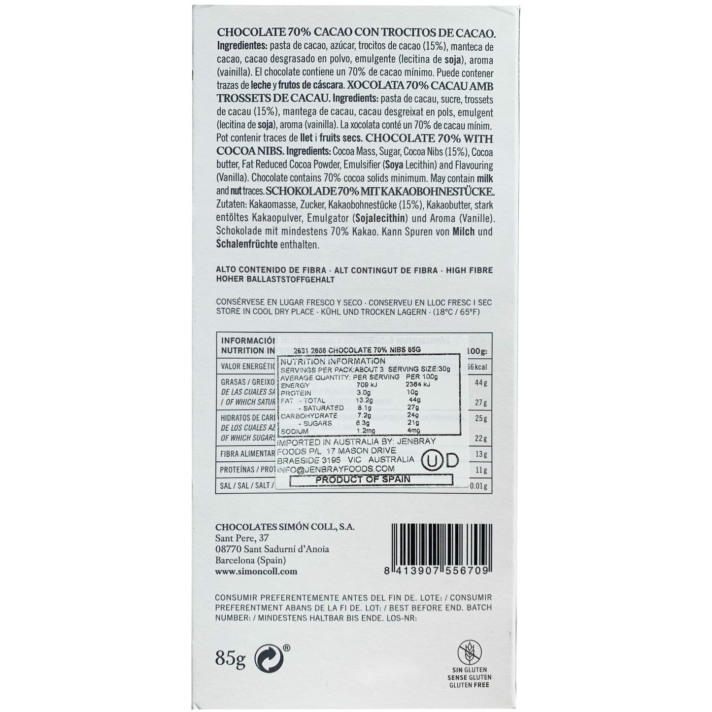 Simon Coll 70% Dark Chocolate Cocoa Nibs 100g