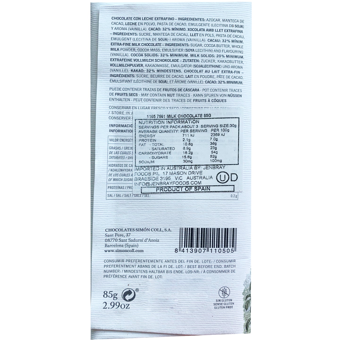 Indulge in the rich and creamy taste of Simon Coll Extra Fine Milk Chocolate 85g. Made with the finest ingredients, this decadent treat is perfect for satisfying your sweet cravings. Treat yourself to a moment of pure bliss with every bite of this luxurious milk chocolate.