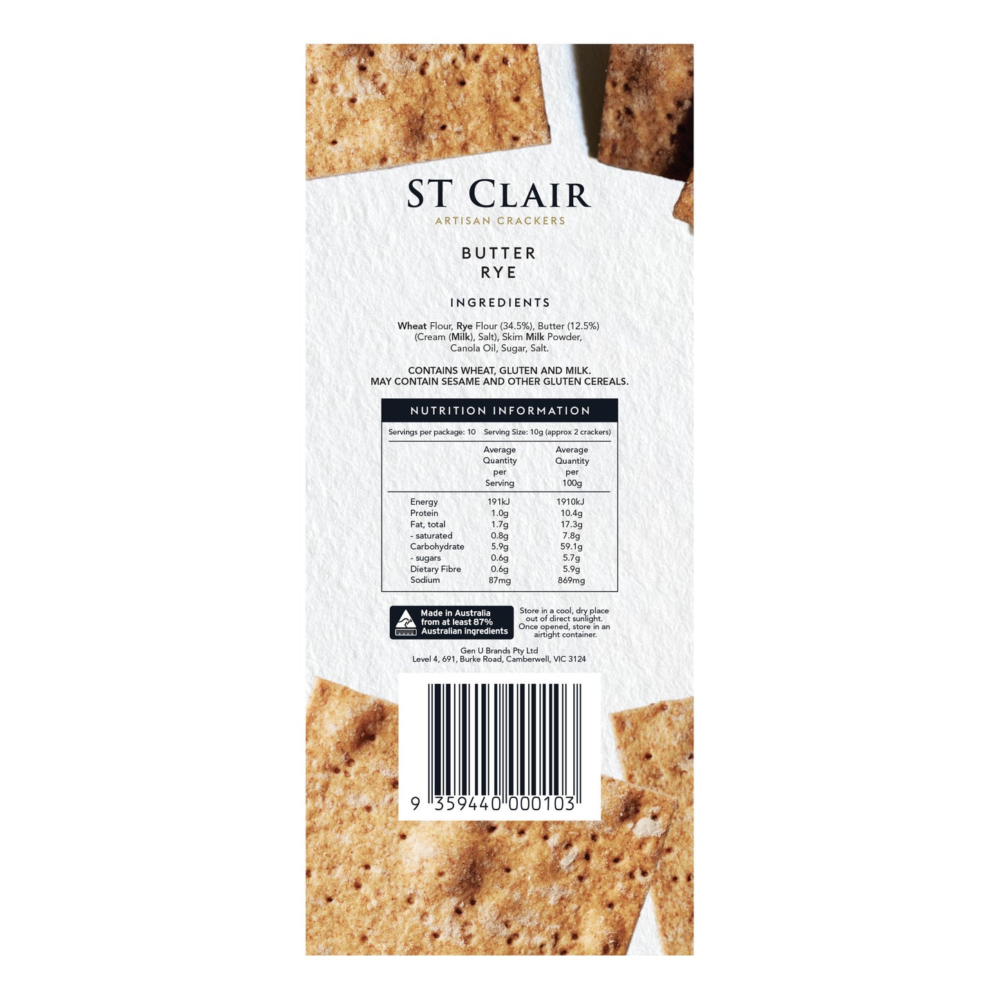 St Clair Artisan Crackers Butter Rye 100g: Indulge in the rich, buttery flavor of our handcrafted rye crackers. Perfect for pairing with your favorite cheeses and spreads, these artisan crackers will elevate your snacking experience to a whole new level. Enjoy a taste of luxury with every bite.