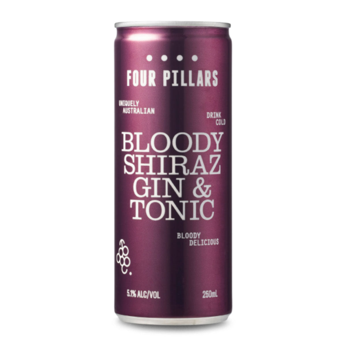 Four Pillars Bloody Shiraz Gin and Tonic Can 4 x 250ml: Indulge in the perfect blend of premium gin infused with bold Shiraz grapes, expertly mixed with tonic water for a refreshing and sophisticated cocktail experience. Enjoy the convenience of ready-to-drink cans, ideal for any occasion. Elevate your gatherings with this unique and flavorful beverage that combines the richness of Shiraz with the crispness of gin.