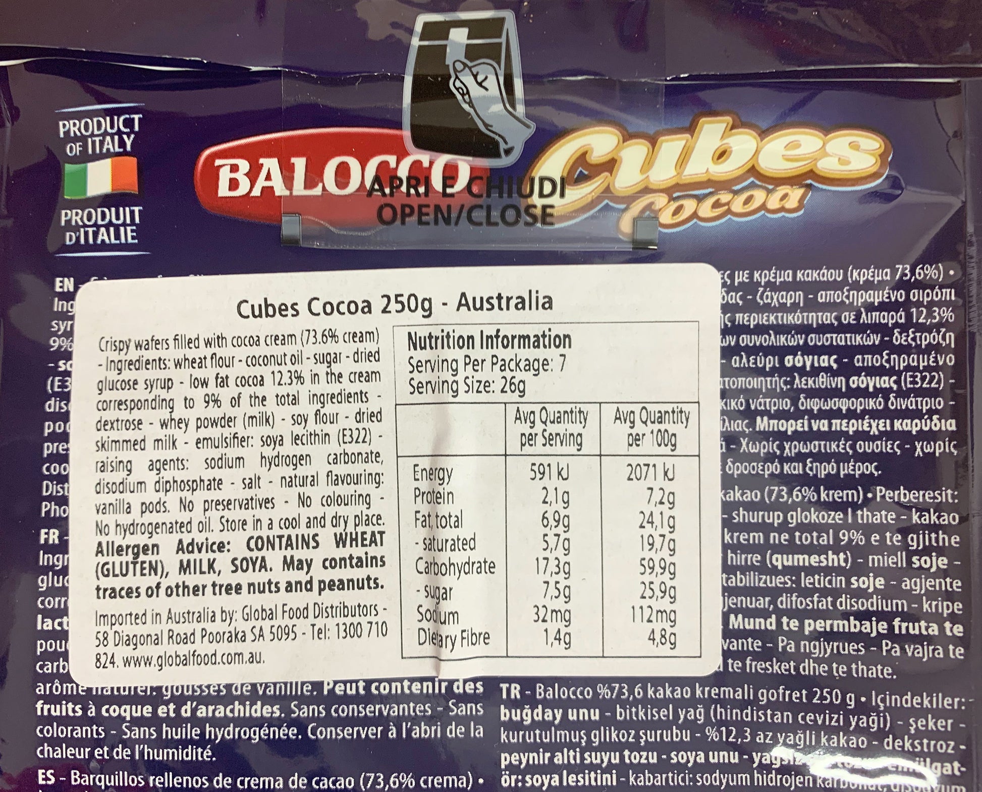 Indulge in the rich and decadent flavor of Balocco Wafers Cubes Cocoa 250g. Perfect for satisfying your sweet cravings, these crispy wafer cubes are a delightful treat for any time of the day. Experience pure cocoa bliss with every bite.