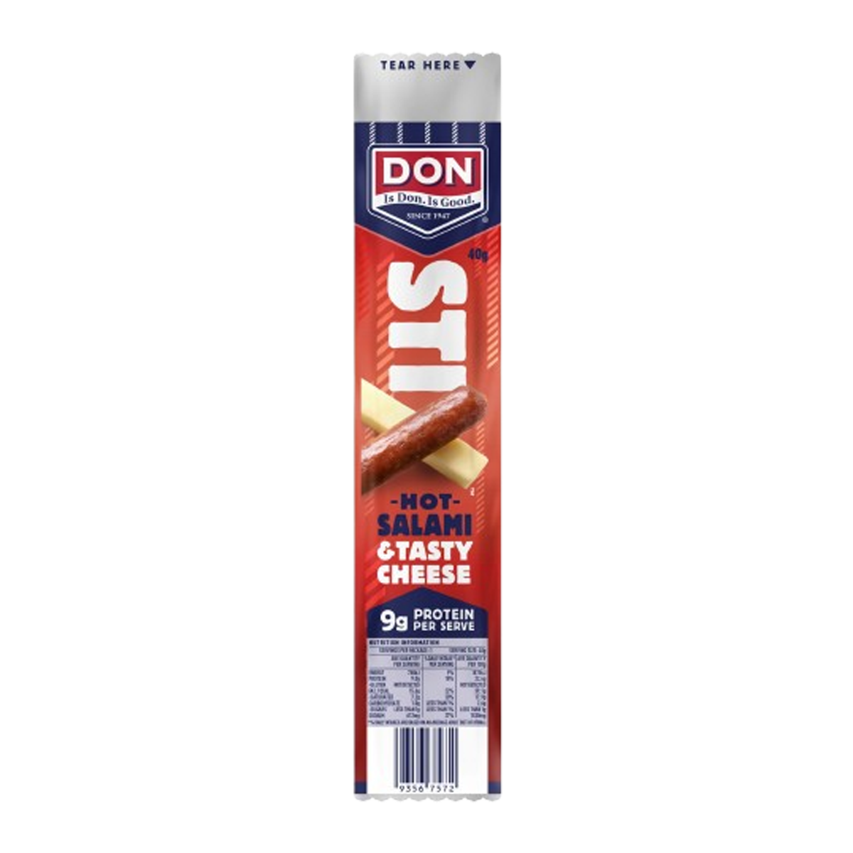 Don Stix Hot Salami and Cheese 40g: Indulge in a savory blend of spicy salami and creamy cheese with our convenient snack pack. Perfect for on-the-go snacking, each bite is bursting with bold flavors that will satisfy your cravings anytime, anywhere. Upgrade your snack game with Don Stix Hot Salami and Cheese today!