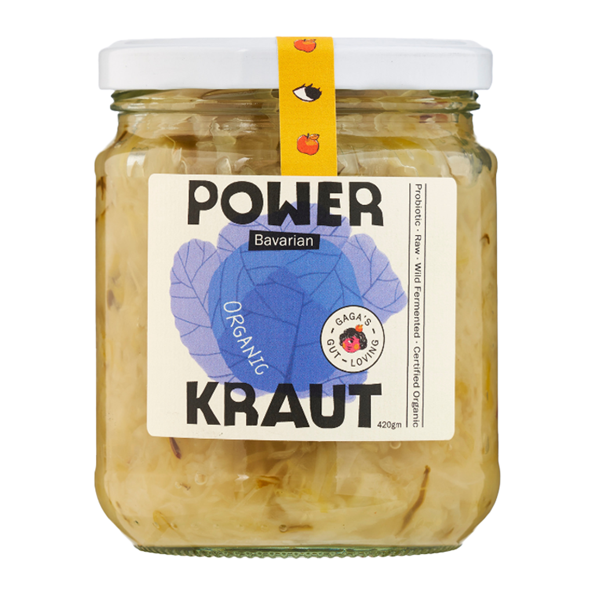 Gaga's Organic PowerKraut Bavarian 450g: Boost your gut health with our probiotic-rich, organic kraut. Packed with flavor and nutrients, this Bavarian delight will elevate your meals and support your digestive system. Try it today for a delicious way to promote overall wellness.