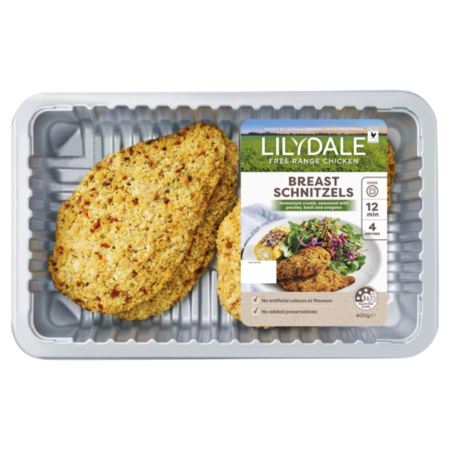 Lilydale Chicken Schnitzel 400g: Deliciously crispy and tender chicken schnitzels that are quick and easy to prepare. Made with premium quality chicken, our schnitzels are perfect for a convenient and satisfying meal any day of the week. Enjoy the classic taste of Lilydale chicken in every bite!