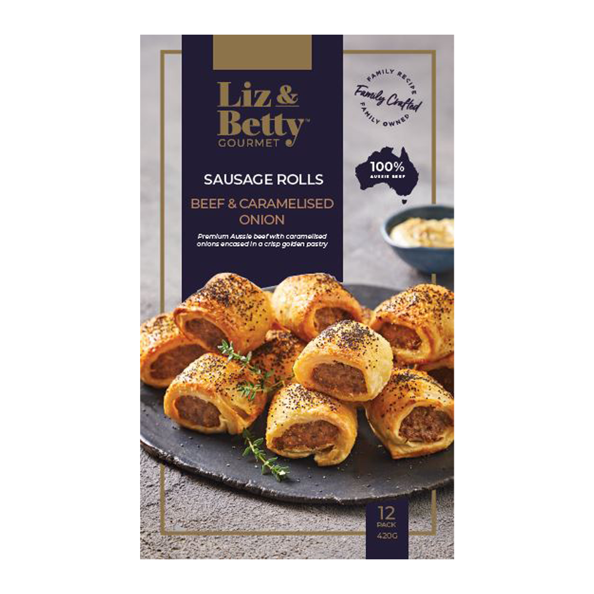 Delight your taste buds with Liz & Betty's savory Beef & Onion Sausage Roll. Made with premium ingredients, this 420g treat is perfect for satisfying your cravings. Enjoy a flavorful snack that's easy to prepare and sure to impress.
