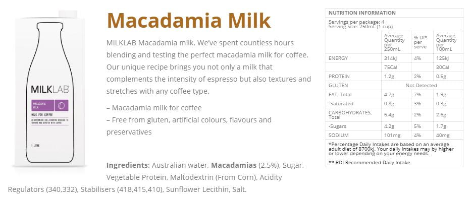 MilkLab Macadamia Milk 1L: Indulge in creamy dairy-free goodness with our rich and velvety macadamia milk. Specially crafted for baristas, this plant-based alternative froths to perfection, creating luscious lattes and cappuccinos. Elevate your coffee experience with MilkLab Macadamia Milk - the perfect blend of taste and texture.