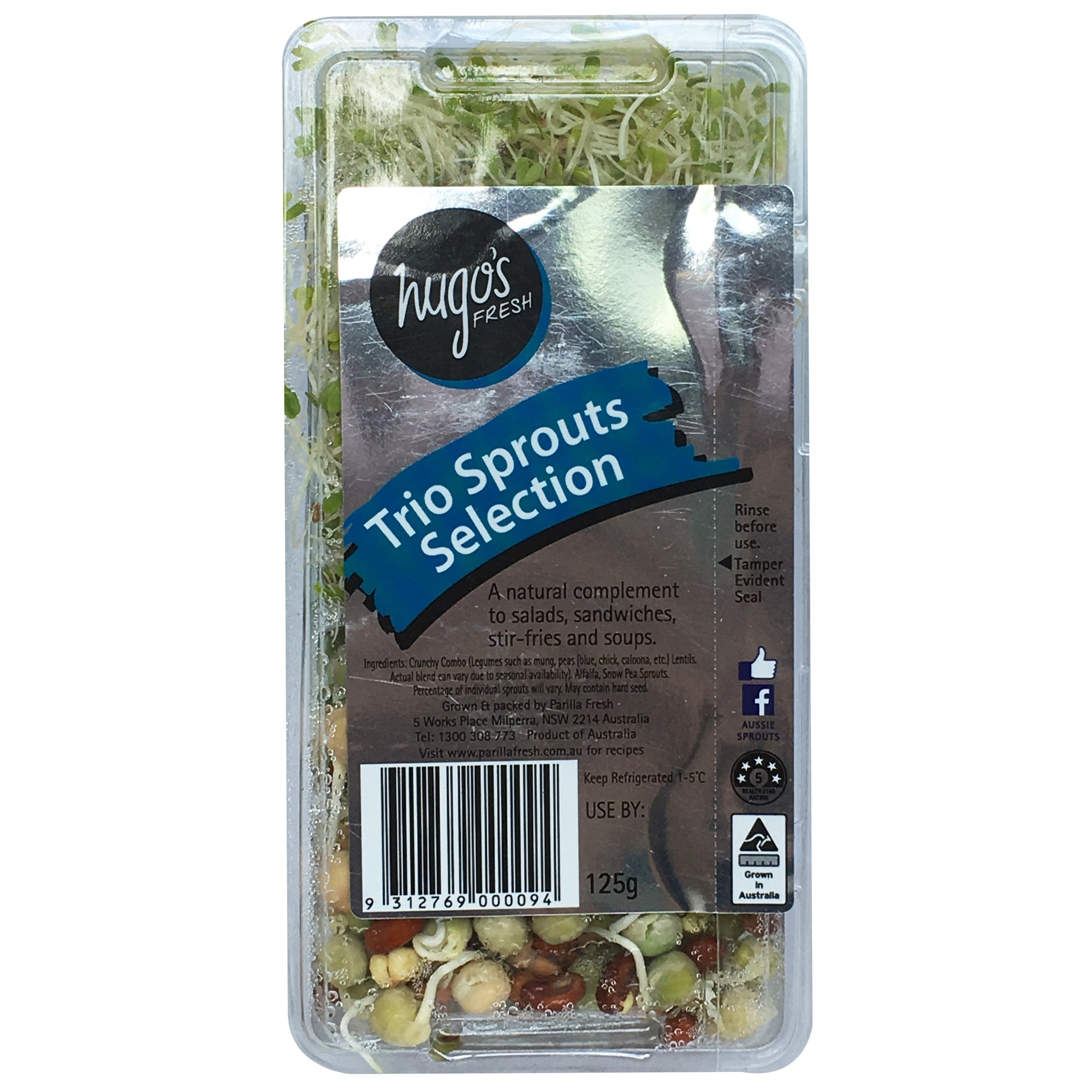 Experience the vibrant crunch of Hugo's Trio Sprouts Selection 125g! Bursting with freshness and packed with flavor, this trio of sprouts offers a delightful mix of nutrients and textures. Elevate your salads, sandwiches, and stir-fries with these high-quality, health-boosting sprouts. Elevate your meals with Hugo's Trio Sprouts Selection today!
