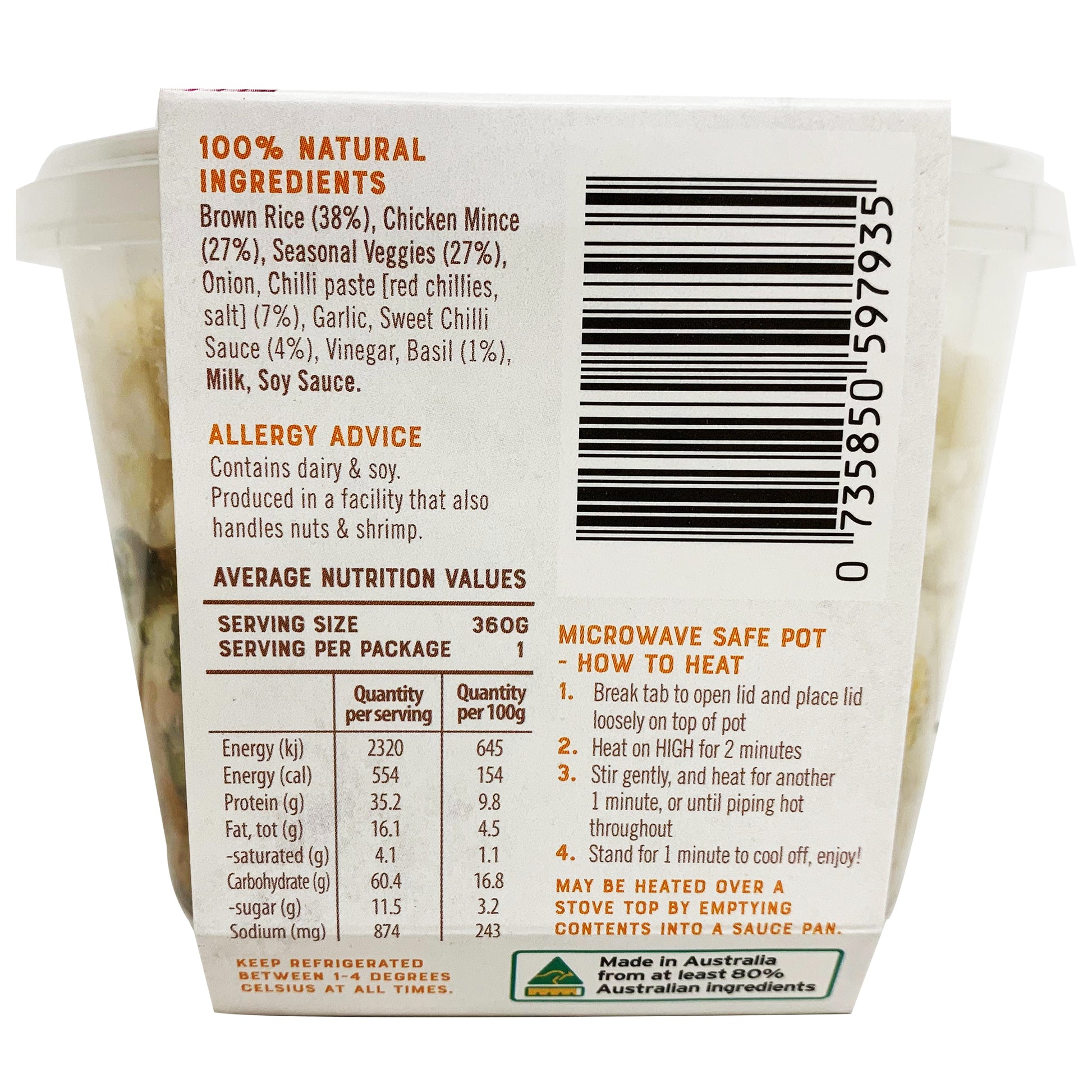 Enjoy a delicious and healthy meal with Thai to Go's Basil and Sweet Chilli Chicken. Made with tender chicken, fragrant basil, and sweet chili sauce, served with nutritious brown rice and seasonal veggies. Conveniently packed in a 360g portion for a satisfying meal on the go. Order now for a flavorful Thai experience!