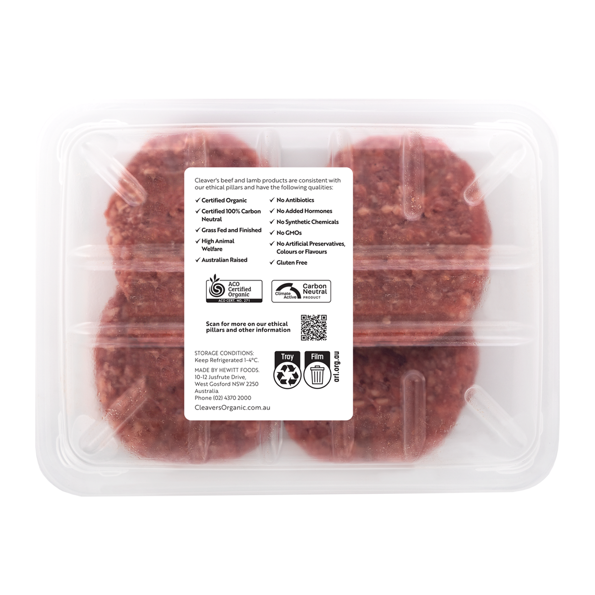 Cleaver's Organic Free Range and Grass Fed Beef Chuck and Brisket Burgers x4 450g