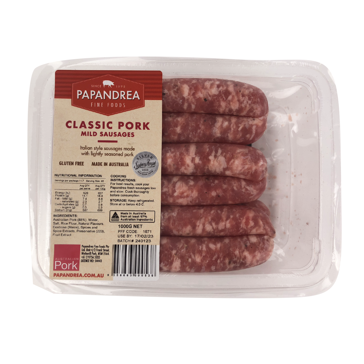 Papandrea Fine Foods Classic Pork Sausages 1kg: Indulge in premium quality sausages bursting with rich, savory flavors. Made with the finest ingredients, these sausages are perfect for grilling, frying, or adding to your favorite recipes. Elevate your meals with the delicious taste of Papandrea Fine Foods Classic Pork Sausages.