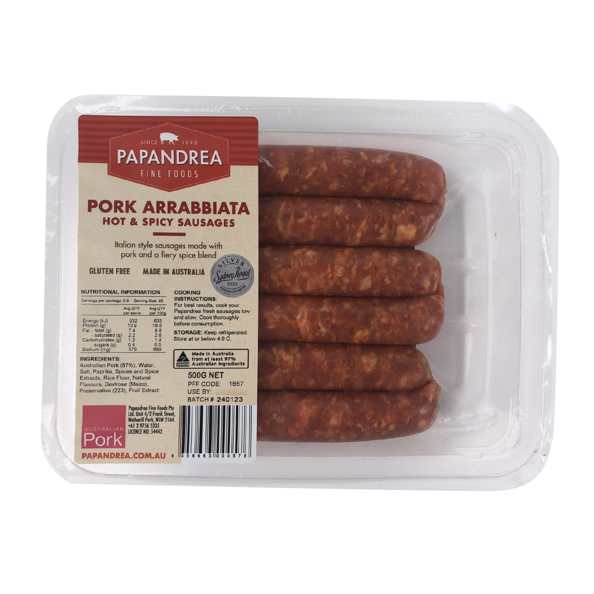 Papandrea Fine Foods Pork Arrabbiata Sausages 500g: Indulge in spicy Italian flavors with our premium pork sausages. Made with the finest ingredients, these sausages are perfect for adding a kick to your meals. Enjoy the convenience of a ready-to-cook product that promises authentic taste and quality. Elevate your dishes with Papandrea Fine Foods Pork Arrabbiata Sausages today!