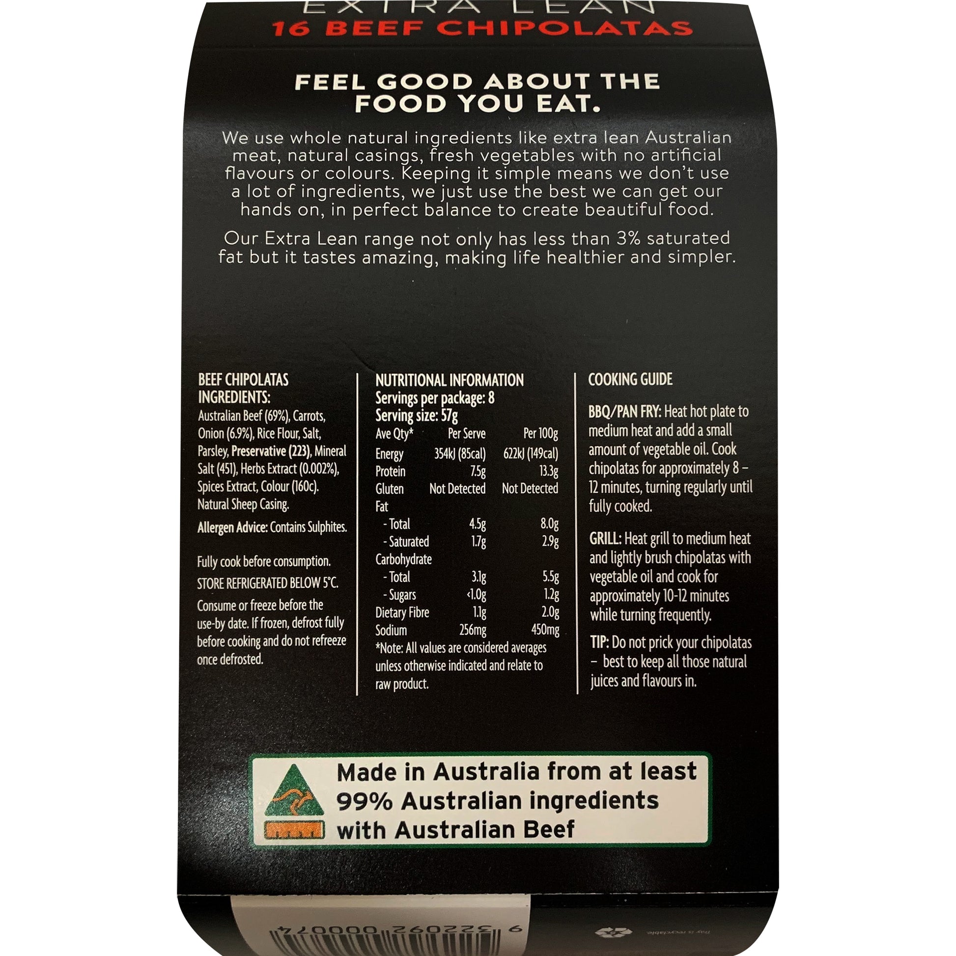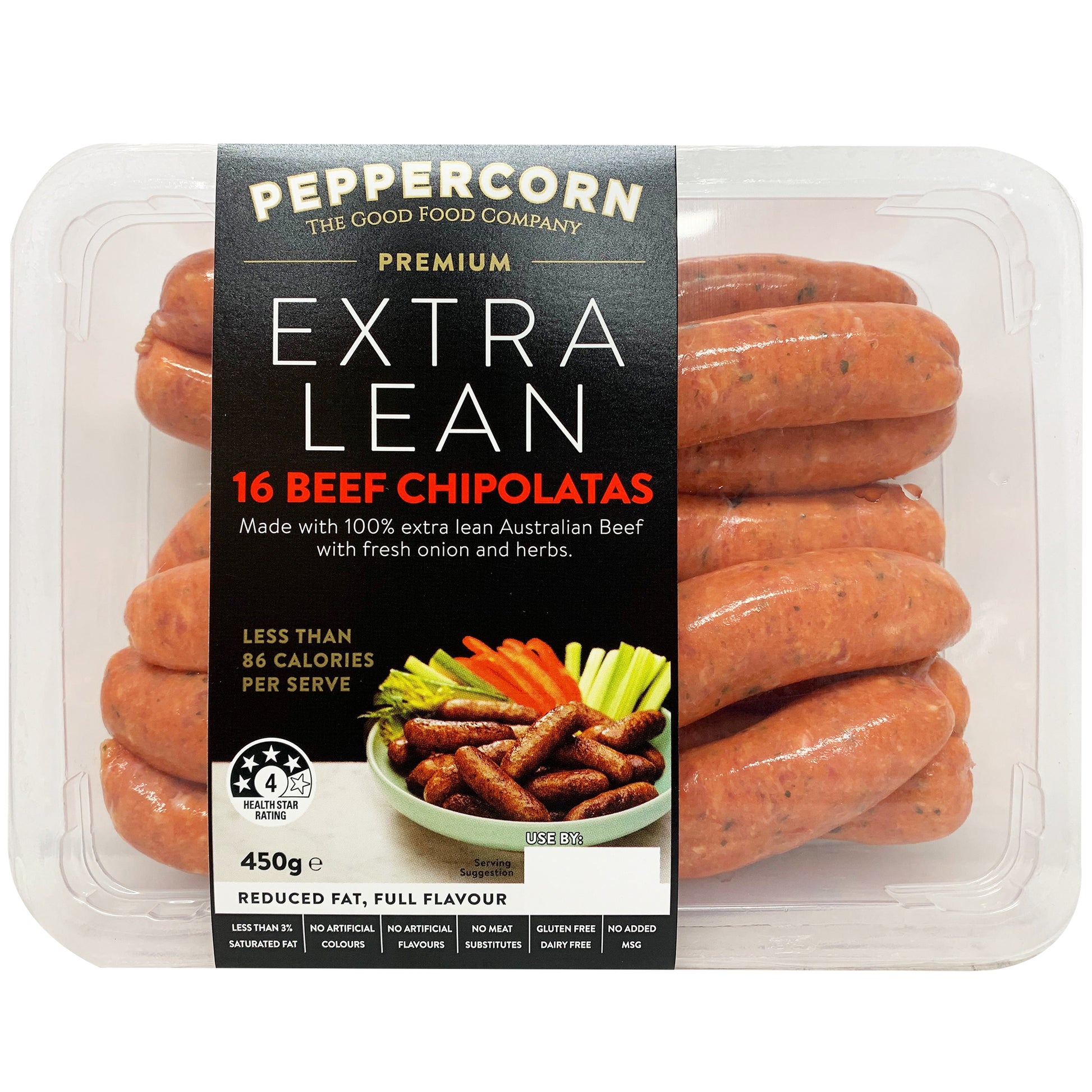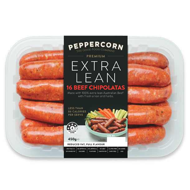 Peppercorn Extra Lean Beef Chipolatas 450g: Deliciously lean and packed with flavor, our chipolatas are the perfect choice for a healthy and satisfying meal. Made with premium beef and a hint of peppercorn, these chipolatas are a must-have for any meat lover. Enjoy the convenience of a quick and easy meal without compromising on taste.