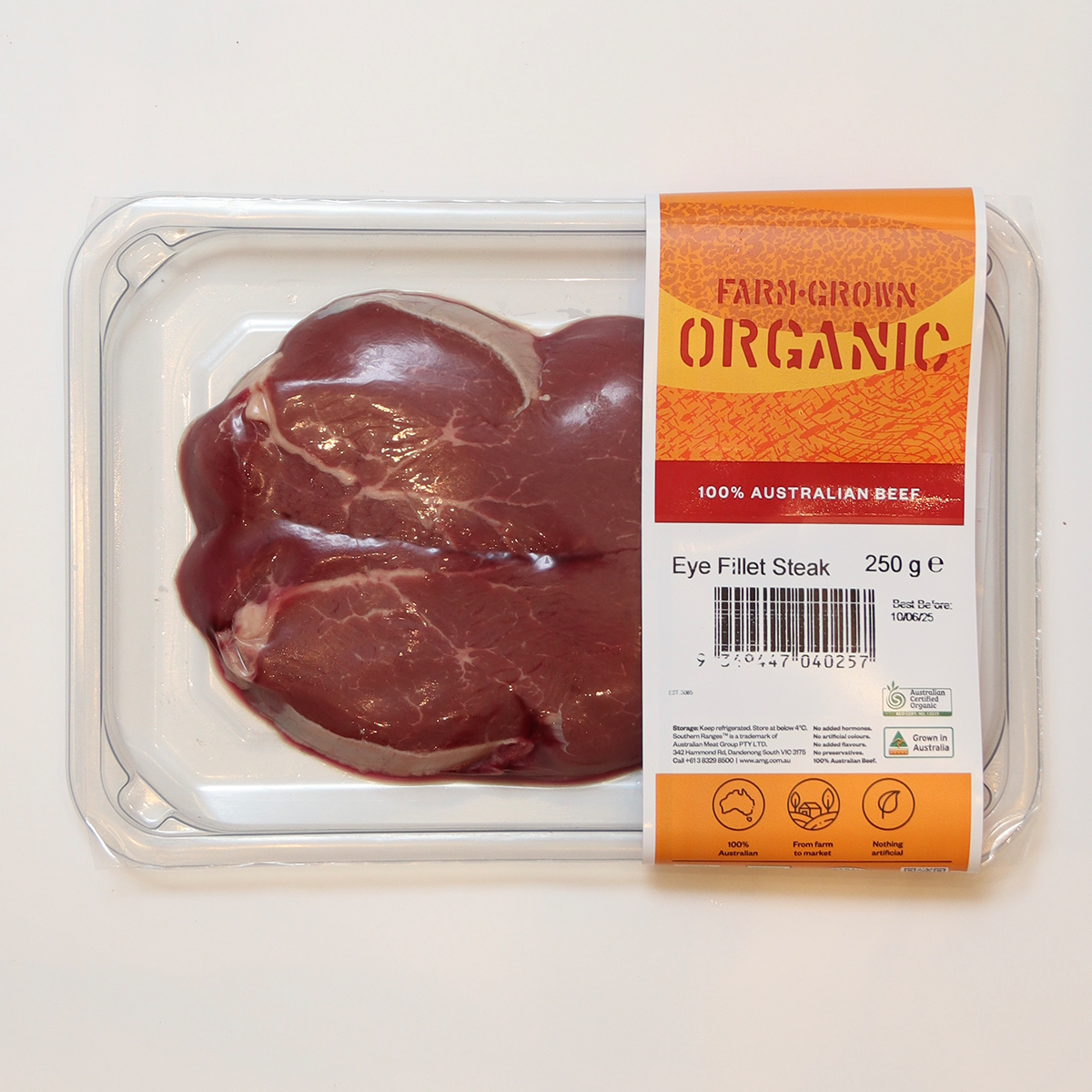 Tender and flavorful Farm Grown Organic Eye Fillet Steak, weighing 250g. Savor the premium quality and rich taste of organic beef, perfect for a delicious and healthy meal. Ideal for steak lovers seeking a top-notch dining experience.