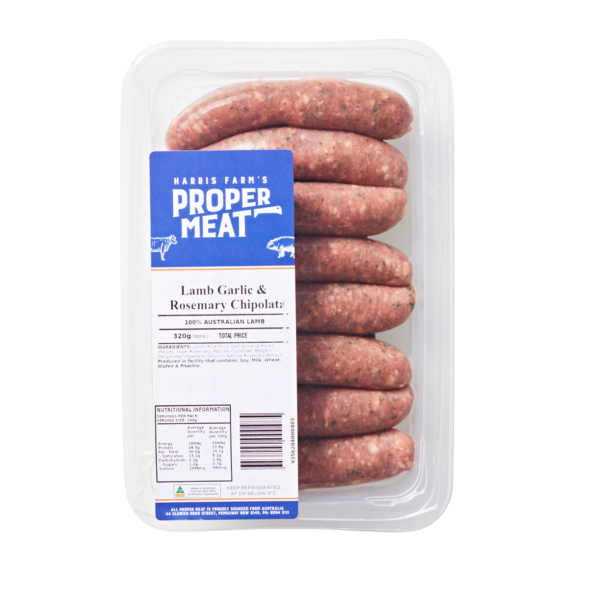 Harris Farm's Proper Meat Lamb Garlic and Rosemary Chipolatas 320g
