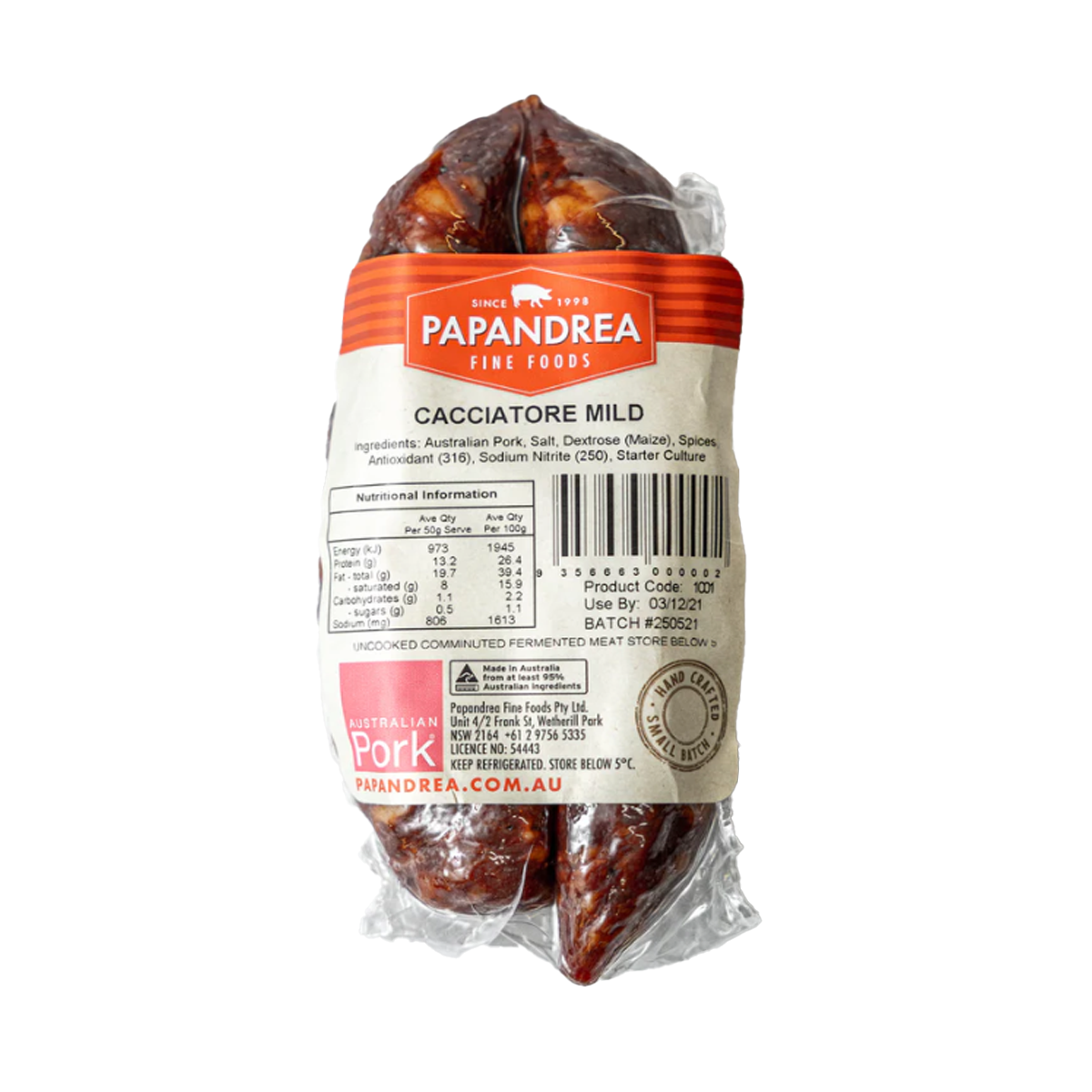 Indulge in the rich flavors of Papandrea Fine Foods Cacciatore Mild Salami Twin Pack 260g. Made with premium ingredients, this savory salami is perfect for adding a touch of Italian tradition to your charcuterie board. Enjoy the convenience of a twin pack, ideal for sharing with loved ones or savoring on your own. Elevate your snacking experience with this delicious and authentic salami.