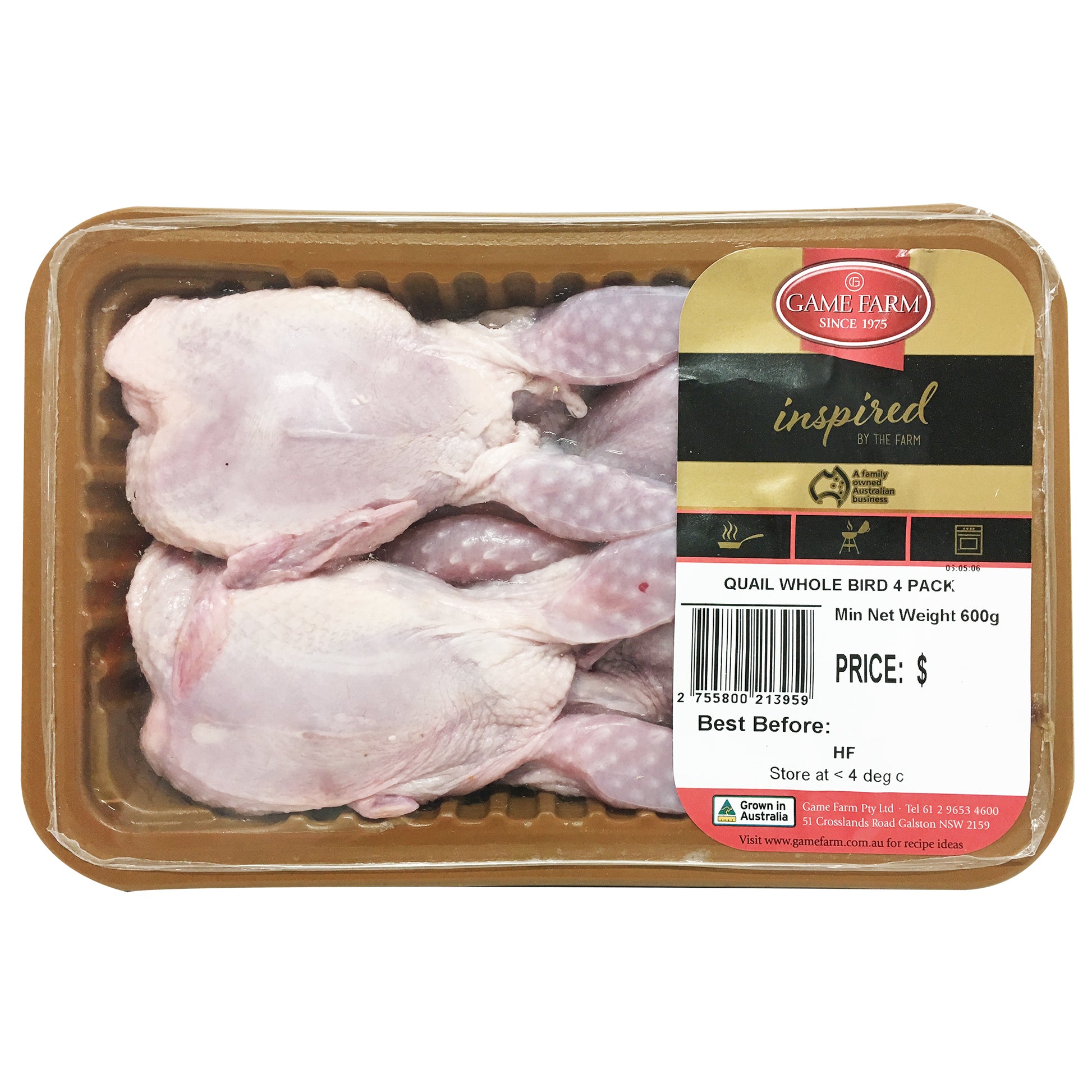 Game Farm Quail Bird 4pk 600g: Elevate your culinary creations with our premium quail birds. Perfect for gourmet dishes, these tender and flavorful birds are a must-have for food enthusiasts. Enjoy convenience and quality in every pack.