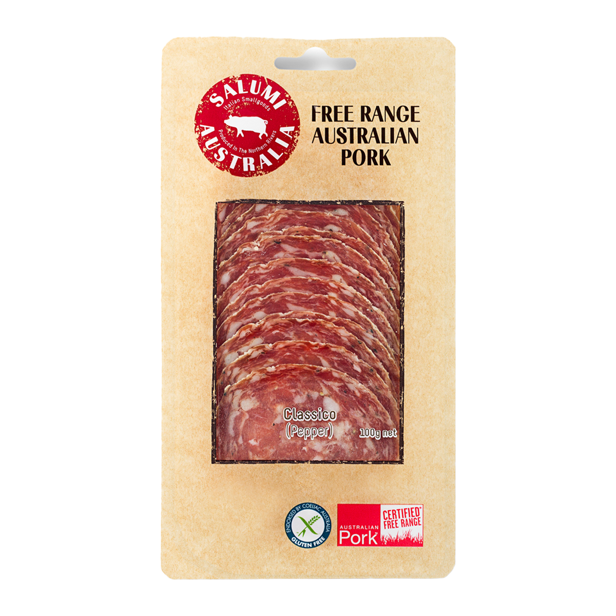 Indulge in the rich and savory flavors of our Salumi Salami Classico Slices. Made from premium ingredients, these perfectly sliced salami pieces are a delicious addition to any charcuterie board or sandwich. Elevate your snacking experience with our 100g pack of authentic Italian salami slices.