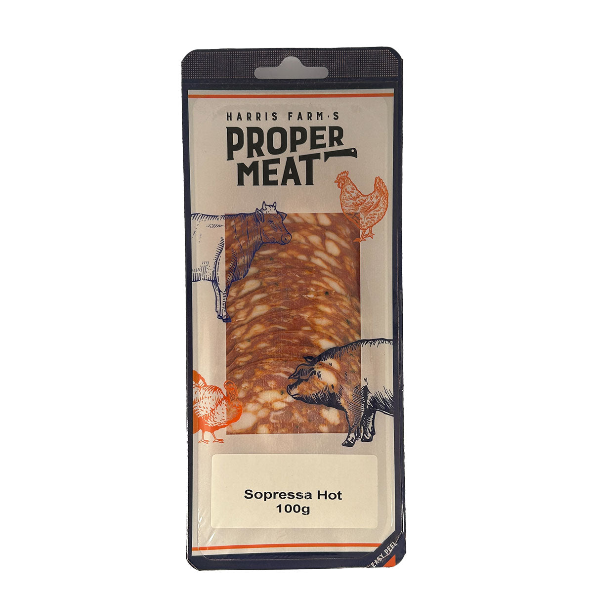 Harris Farm's Proper Meat Sopressa Hot 100g offers a bold and spicy flavor experience, perfect for charcuterie boards or snacking. Made with high-quality ingredients, this artisanal salami is sure to elevate your next meal or gathering. Enjoy the authentic taste of Italy with every bite of this delicious and convenient 100g pack.