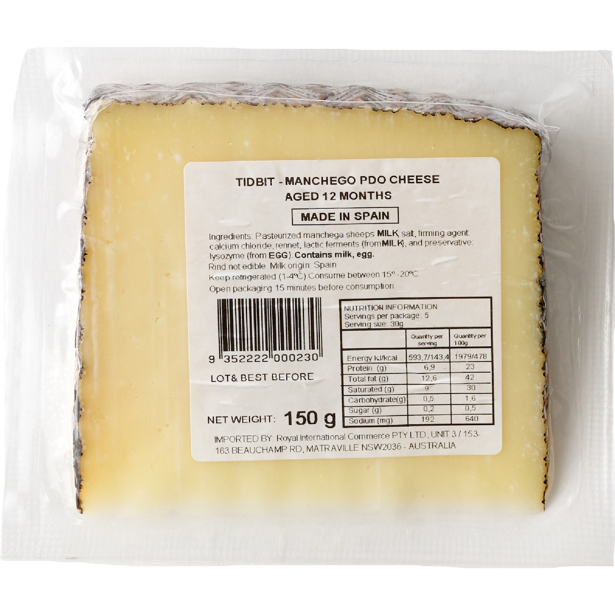 Indulge in the rich and nutty flavors of Royal International Tidbit Vintage Manchego Cheese. Aged for 12 months, this 150g portion is perfect for savoring alone or pairing with your favorite wine. Elevate your snacking experience with this premium, high-quality cheese.