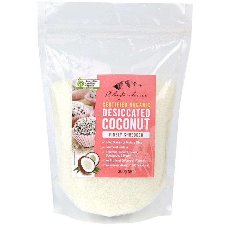 Chef's Choice Organic Finely Shredded Desiccated Coconut 300g is the perfect addition to your pantry for creating delicious and healthy recipes. Made from high-quality organic coconuts, this finely shredded coconut is packed with natural flavor and nutrients. Elevate your dishes with this versatile ingredient that is gluten-free, vegan, and non-GMO. Order now to add a touch of tropical goodness to your meals!