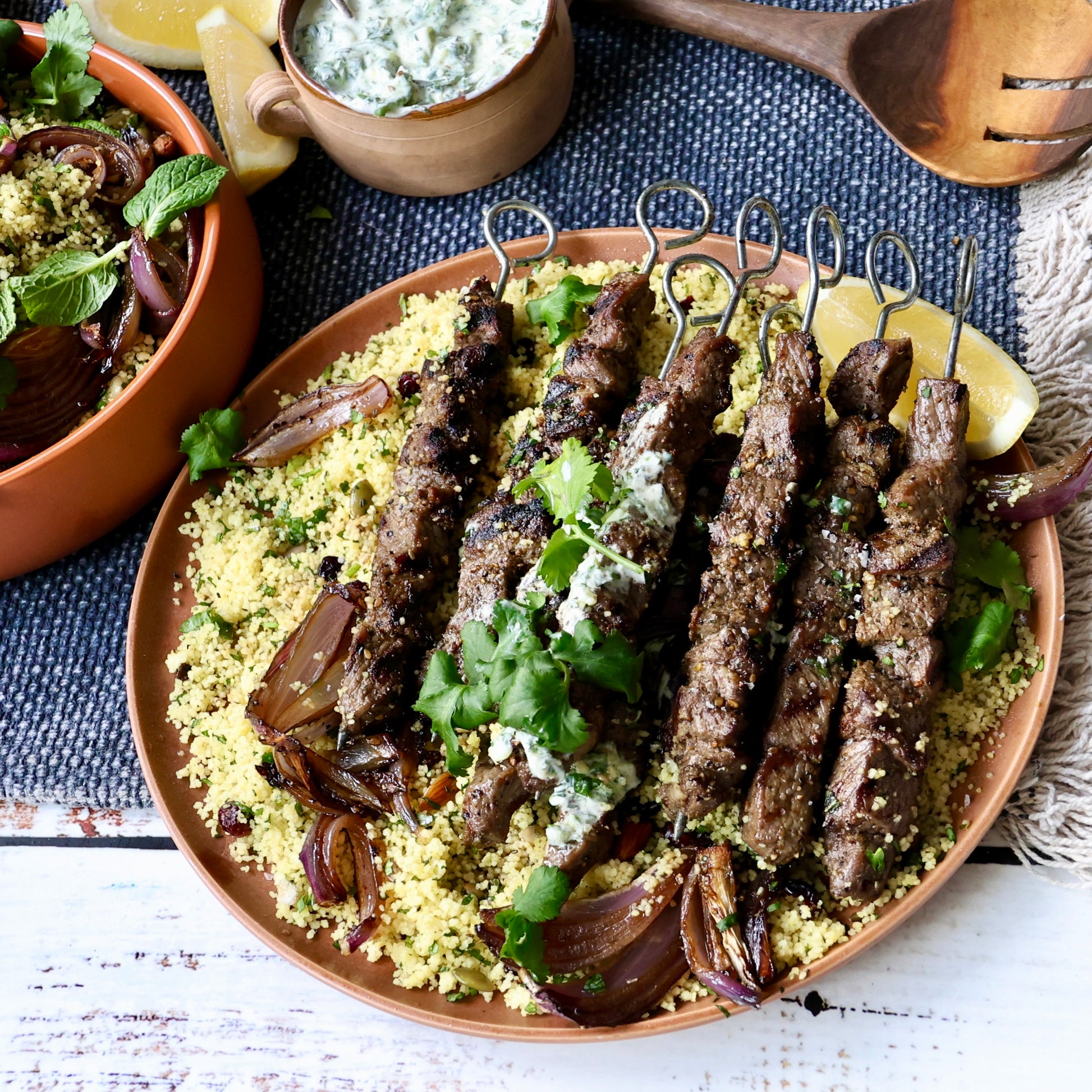 Organic Lamb Skewers with Couscous Salad and Herb Lemon Yoghurt