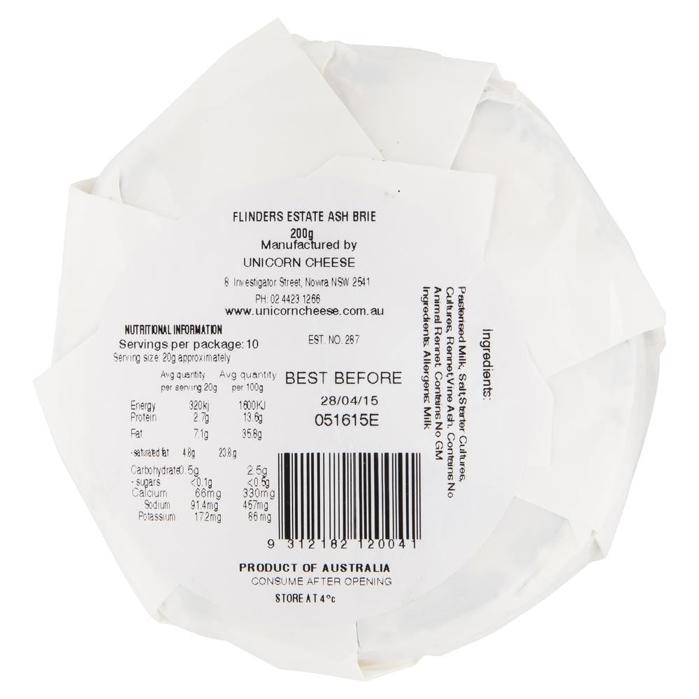 Indulge in the creamy richness of Flinders Estate Shoalhaven Ash Brie Cheese. Made from high-quality ingredients, this 200g cheese offers a luxurious taste experience. Perfect for cheese boards, sandwiches, or pairing with your favorite wine. Elevate your culinary creations with this exquisite brie cheese.