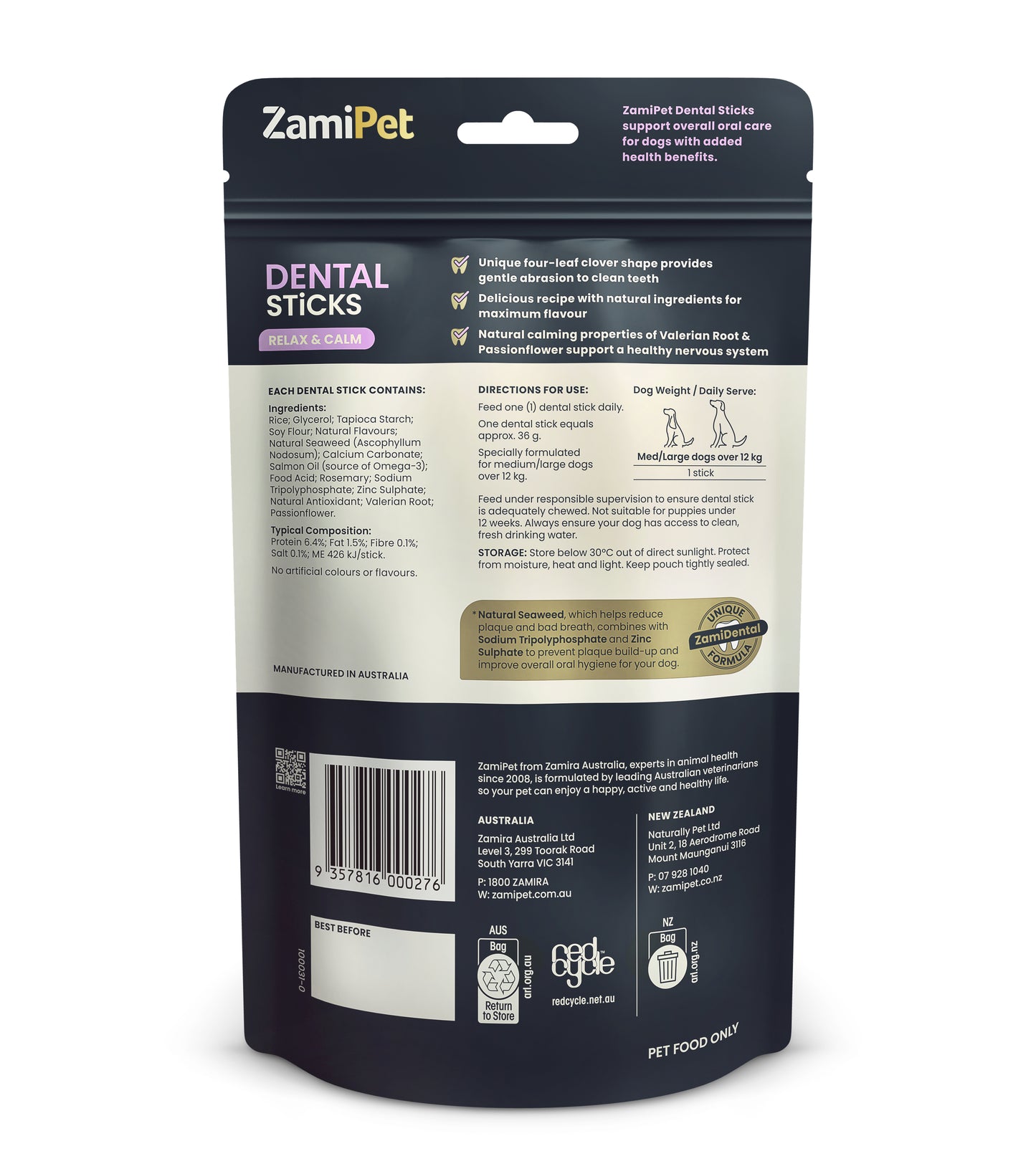 ZamiPet Dental Sticks Relax & Calm Med/Large Dogs x6 200g promote dental health and relaxation in medium to large dogs. With a delicious taste and calming properties, these sticks help reduce anxiety while keeping teeth clean and breath fresh. Perfect for pet owners looking to improve their dog's oral hygiene and overall well-being.