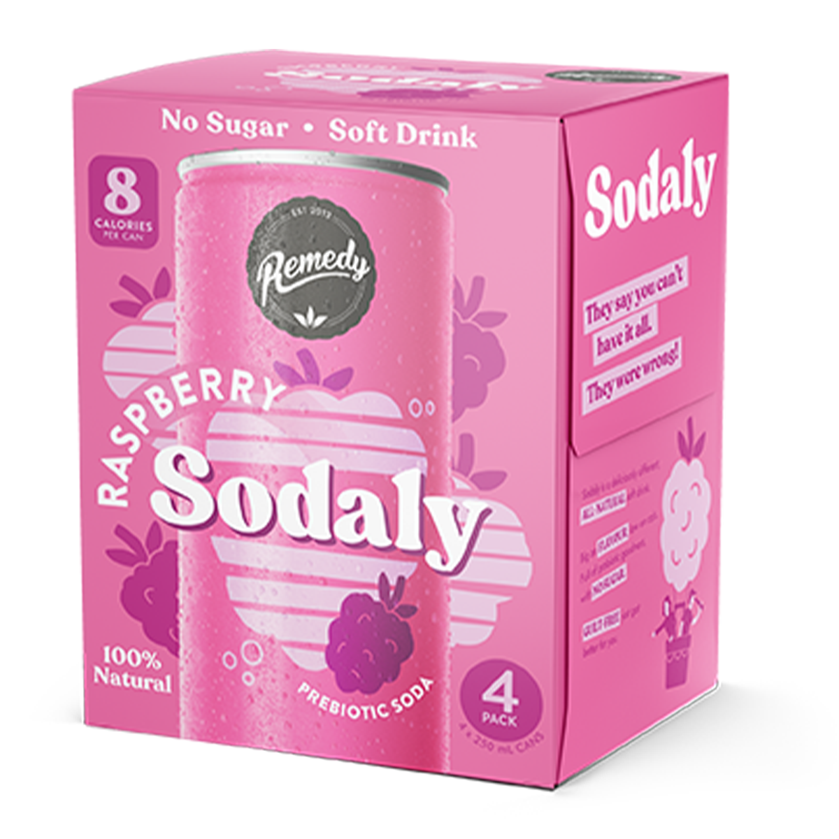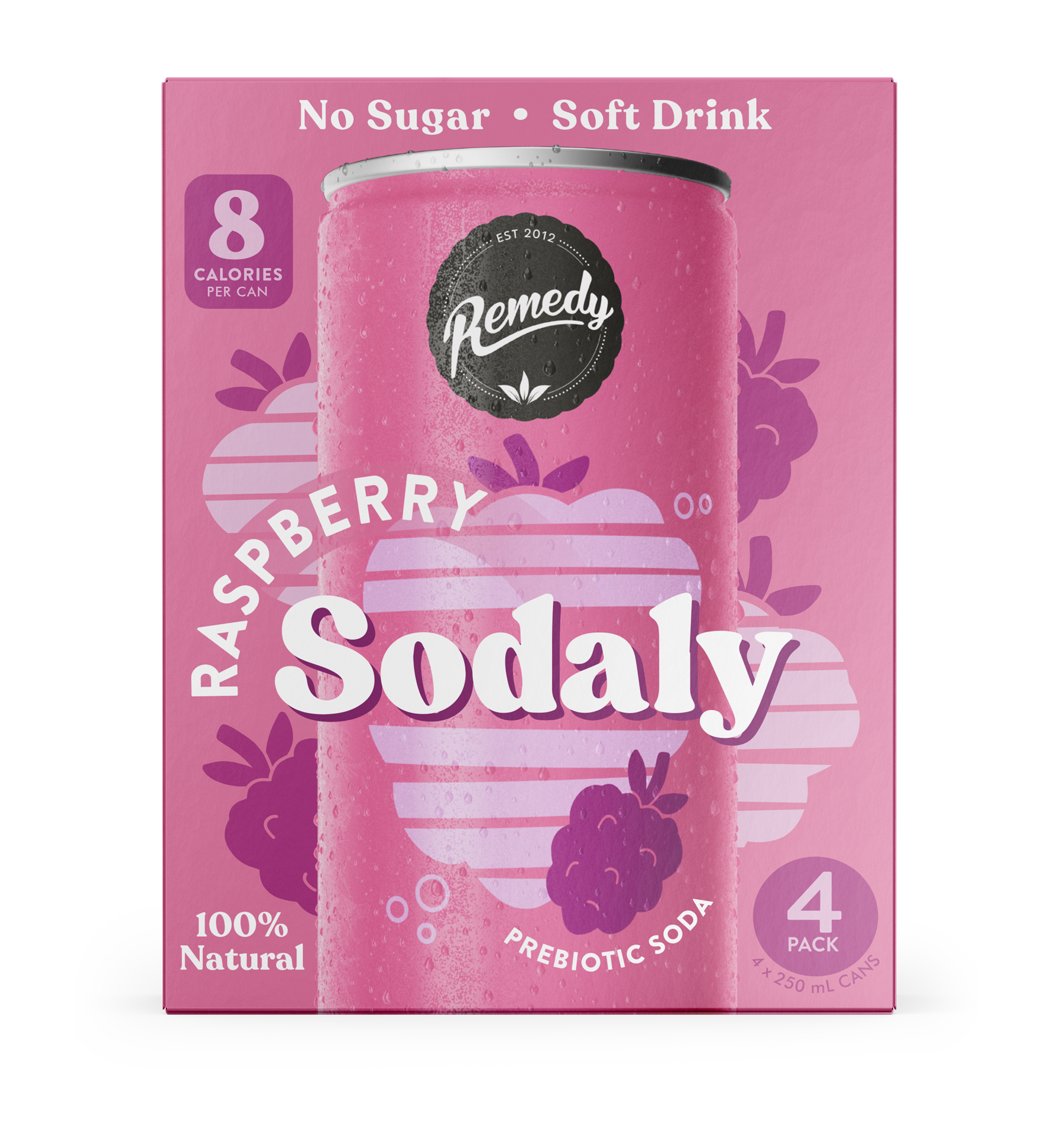 Remedy Sodaly Raspberry 4x250mL: Enjoy the refreshing taste of real raspberries with this pack of 4 sparkling sodas. Made with all-natural ingredients and no artificial sweeteners, it's the perfect guilt-free treat for any occasion. Quench your thirst and satisfy your cravings with Remedy Sodaly Raspberry!