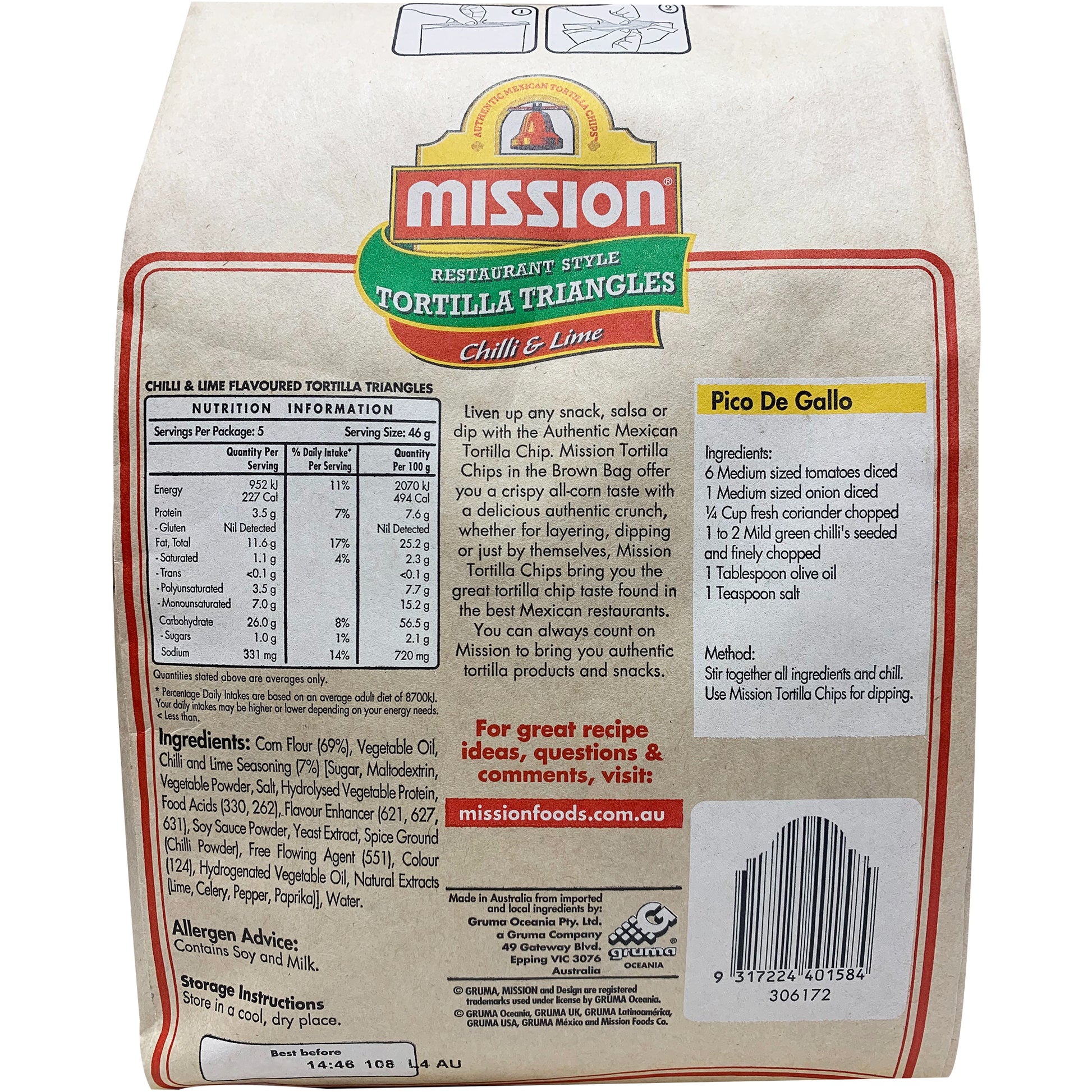 Enjoy a zesty kick with Mission Tortilla Triangles Chilli and Lime 230g. Perfect for snacking or adding a flavorful crunch to your favorite dishes. Elevate your taste buds with every bite!
