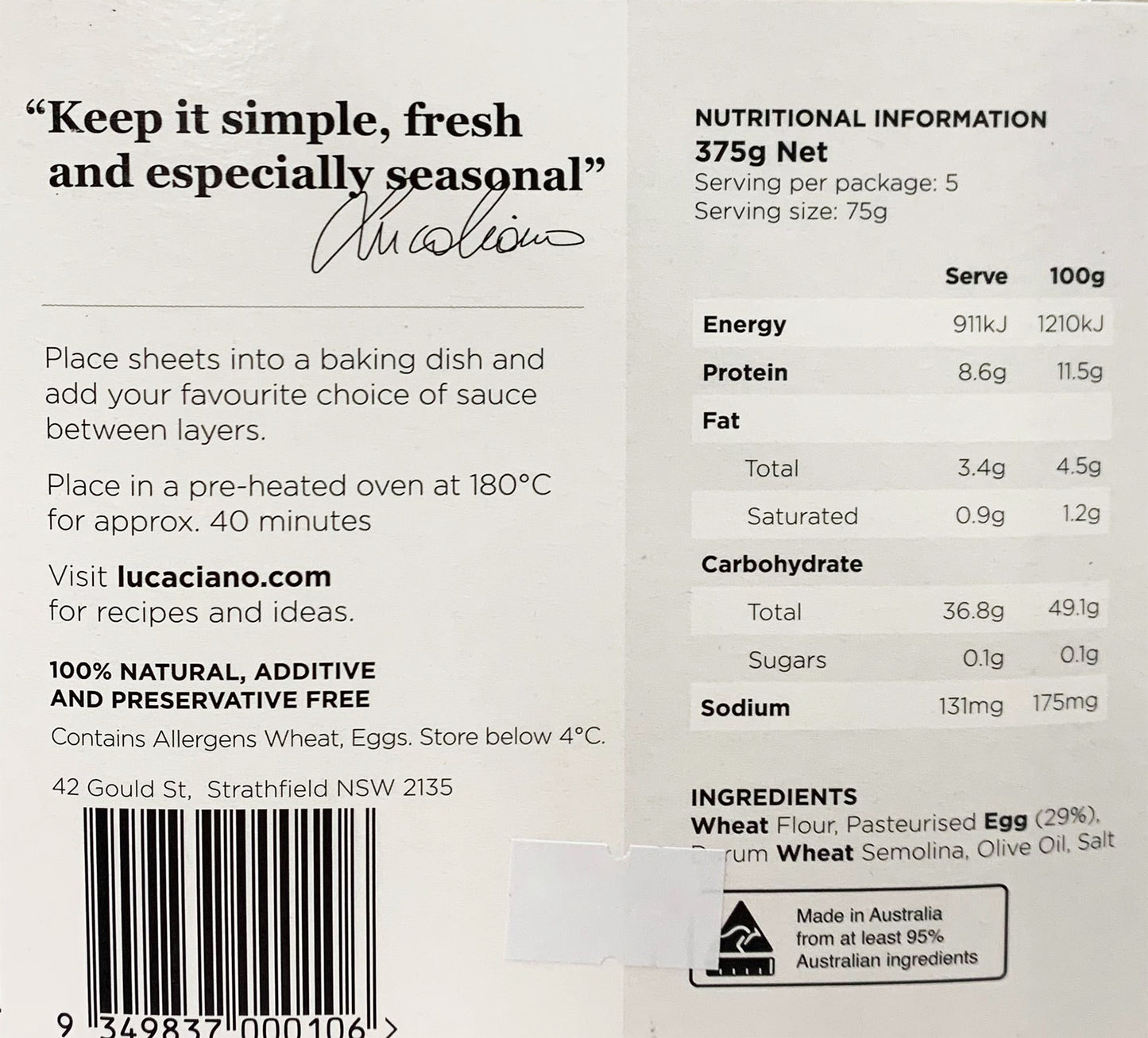 Luca Ciano Fresh Egg Pasta Lasagna Sheets 375g