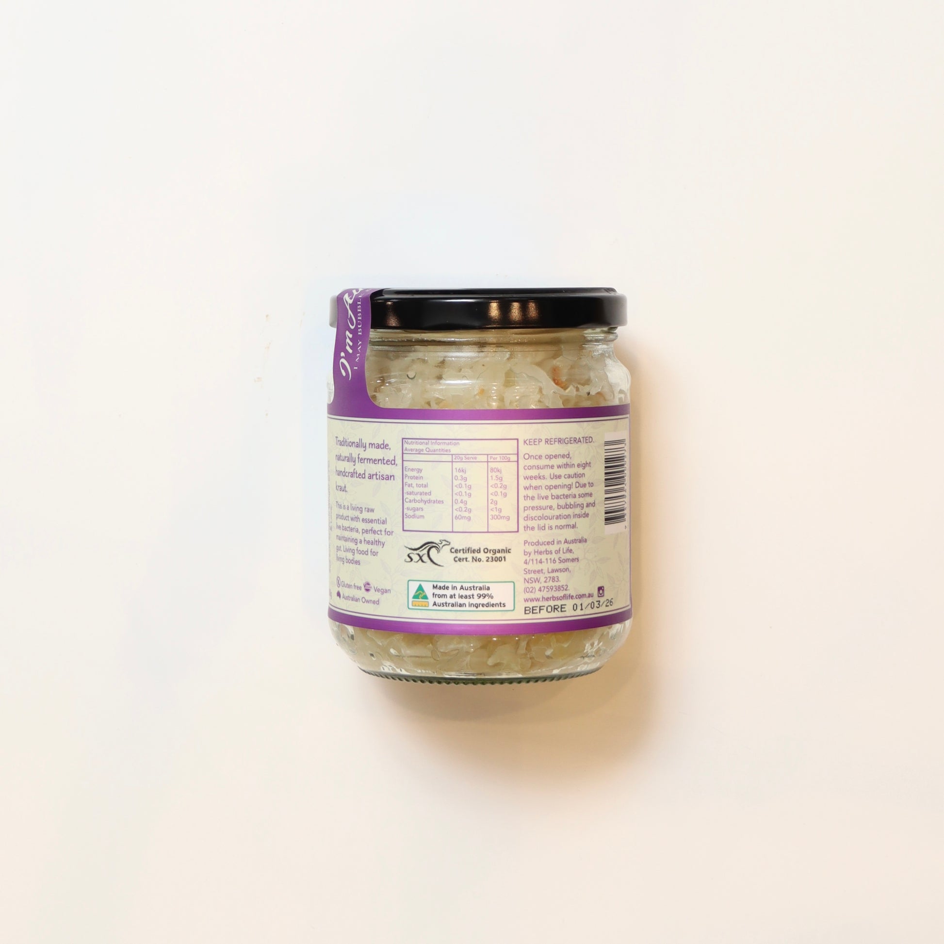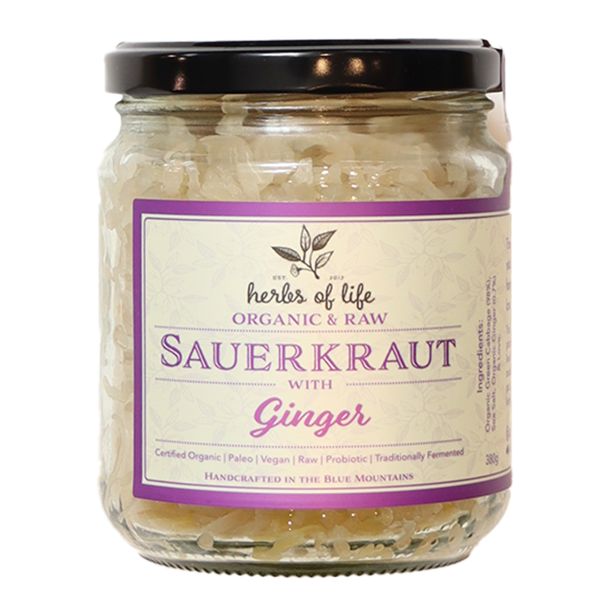 Herbs of Life Organic Sauerkraut Ginger 380g: Boost your gut health with our probiotic-rich sauerkraut infused with zesty ginger. Made with organic ingredients for a flavorful and nutritious addition to your meals. Improve digestion and support your immune system with every crunchy bite.