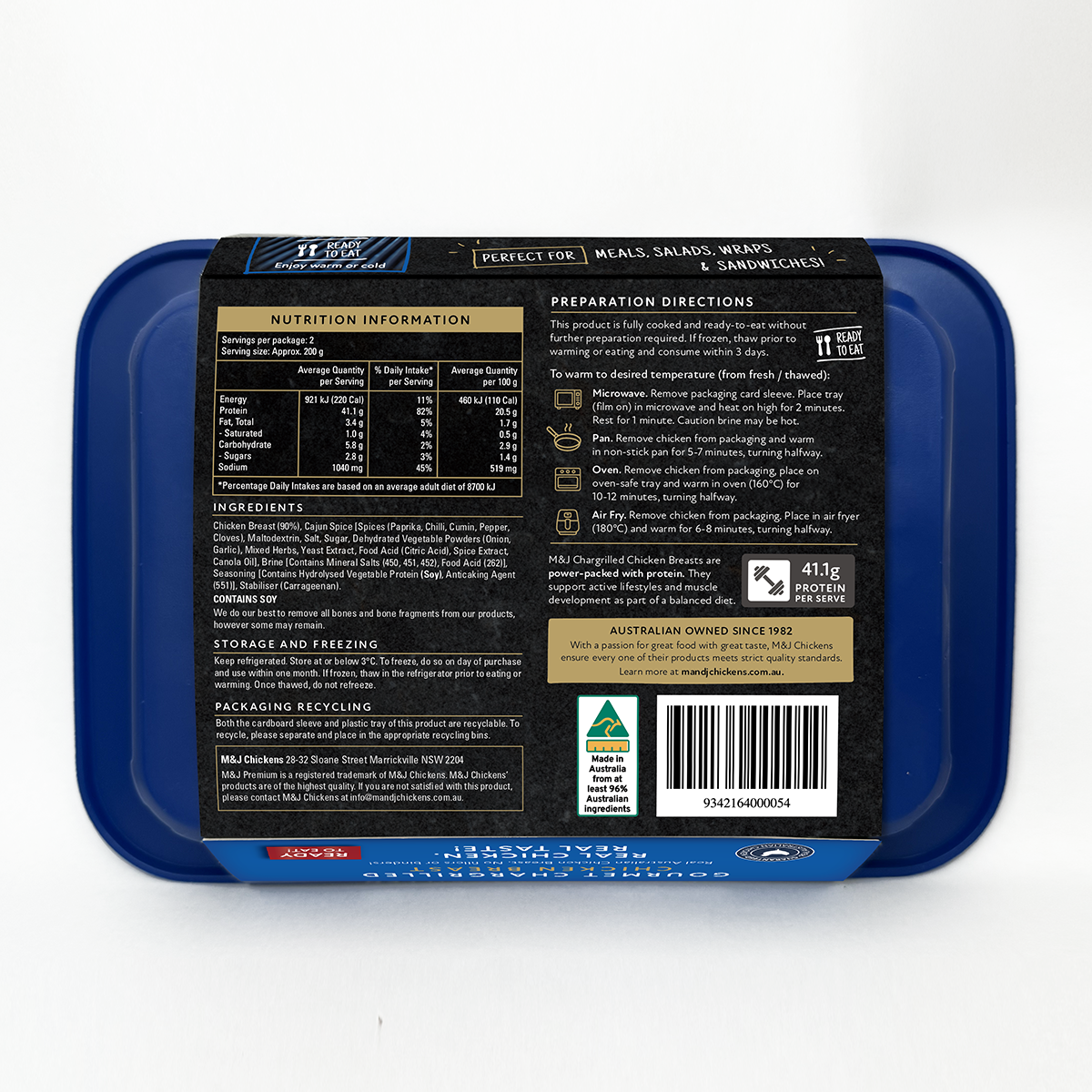 M&J's char-grilled chicken breast combines succulent, flame-kissed poultry with vibrant lemon and herb infusions. Each 400g pack delivers restaurant-quality convenience—tender, protein-rich chicken ready to elevate weeknight dinners or sophisticated entertaining. The aromatic blend of citrus and herbs creates a refined flavour profile that pairs beautifully with fresh vegetables, grains, or salads. Perfect for discerning home cooks seeking premium prepared meals without compromise.