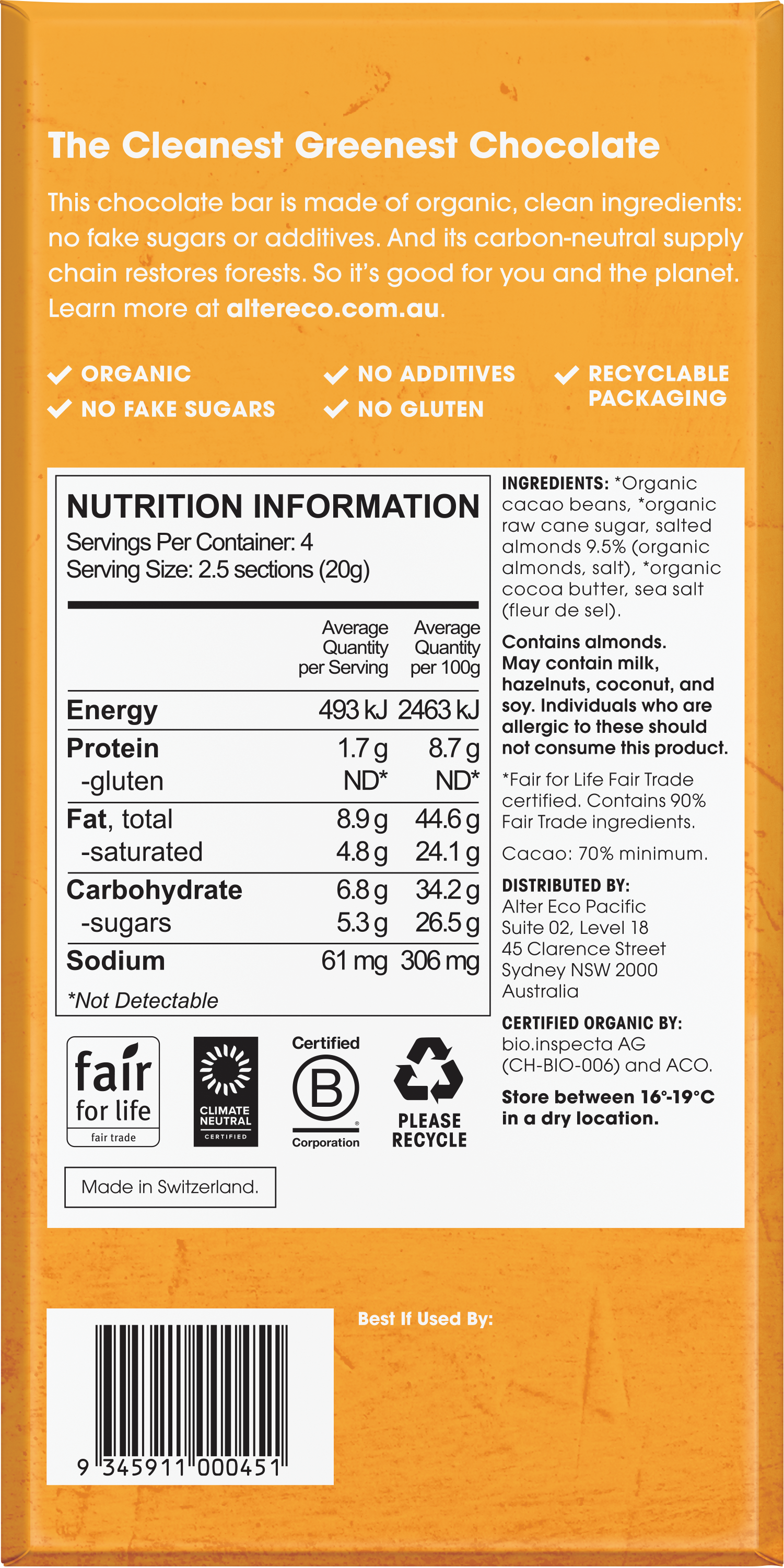 Indulge in the rich and decadent flavor of Alter Eco Organic Dark Chocolate Salted Almond. Made with premium organic ingredients, this 80g bar is the perfect blend of smooth dark chocolate and crunchy almonds, sprinkled with a touch of sea salt. Satisfy your cravings with this guilt-free treat that is not only delicious but also ethically sourced and environmentally friendly. Elevate your snacking experience with Alter Eco Organic Dark Chocolate Salted Almond.