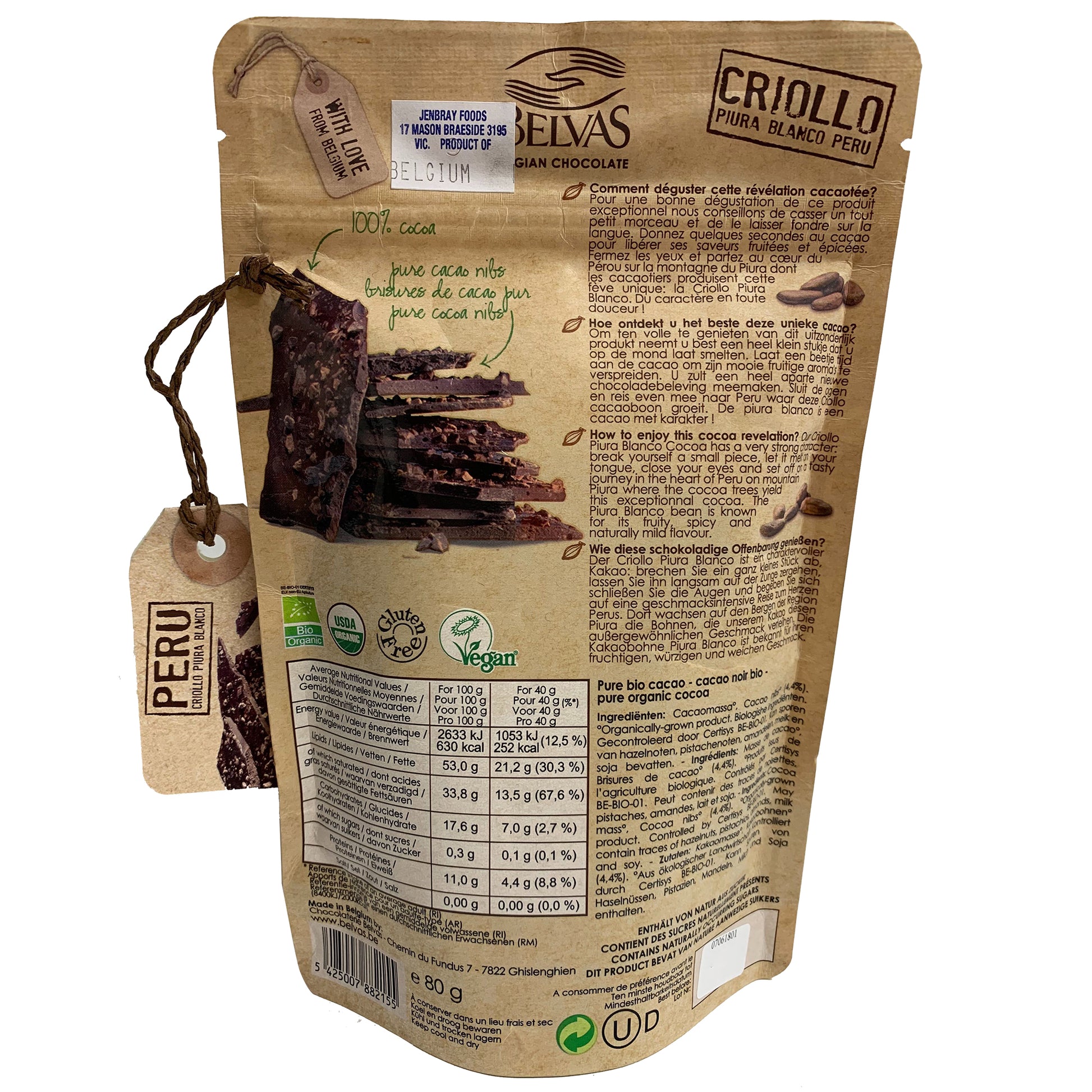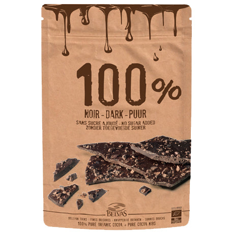 Indulge in the rich and intense flavor of Belvas 100% Noir Dark Puur Dark Chocolate. Made with 100% pure cocoa, this 120g bar is a guilt-free treat for dark chocolate lovers. Satisfy your cravings with this organic, vegan, and gluten-free delight.