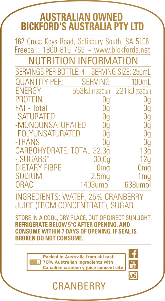 Bickford's Cranberry Juice 1L: Enjoy the refreshing taste of pure cranberries with our antioxidant-rich juice. Perfect for boosting immunity and promoting overall health. Get your daily dose of goodness with Bickford's Cranberry Juice 1L.