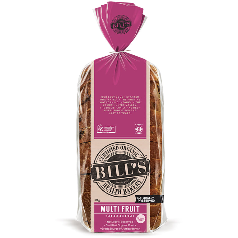 Bill's Organic Multi Fruit Sourdough 660g is a delicious blend of organic fruits and sourdough, packed with nutrients and bursting with flavor. Enjoy a healthy and satisfying breakfast or snack that will keep you energized throughout the day. Perfect for those looking for a tasty and wholesome option that supports a balanced diet.