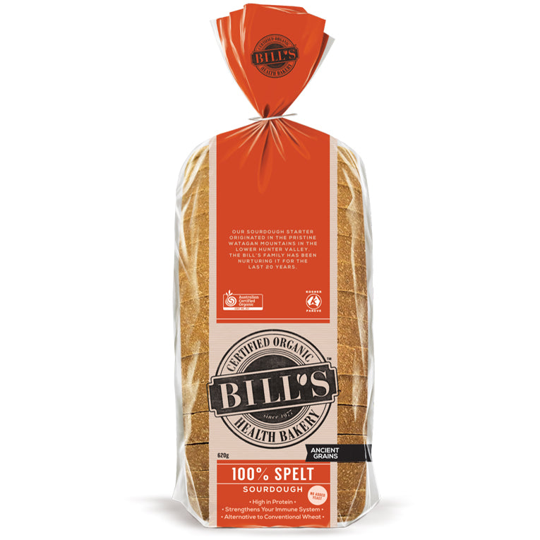 Bills Organic Spelt Sourdough 620g: Enjoy the rich, nutty flavor of organic spelt in every bite of our artisan sourdough bread. Made with care and expertise, this wholesome loaf is perfect for those seeking a delicious, healthy bread option. Taste the difference with Bill's Organic Spelt Sourdough today!