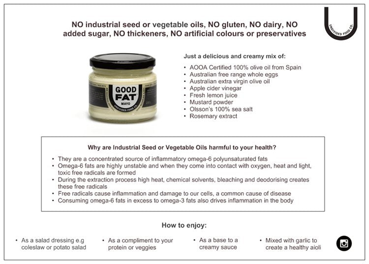 Undivided Food Co Good Fat Mayo 280g is a delicious and healthy alternative to traditional mayonnaise. Packed with good fats and free from artificial ingredients, this mayo is perfect for those looking to enjoy a guilt-free condiment that doesn't compromise on taste. Upgrade your meals with this creamy and flavorful mayo that will leave you satisfied and feeling good about your food choices.