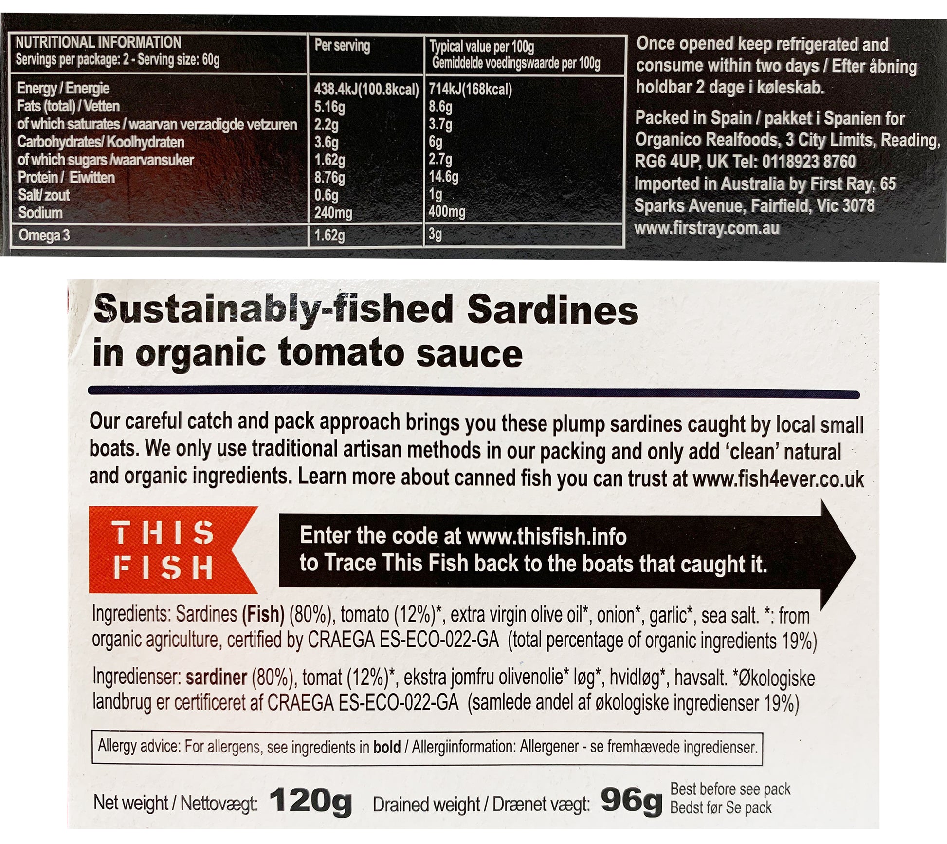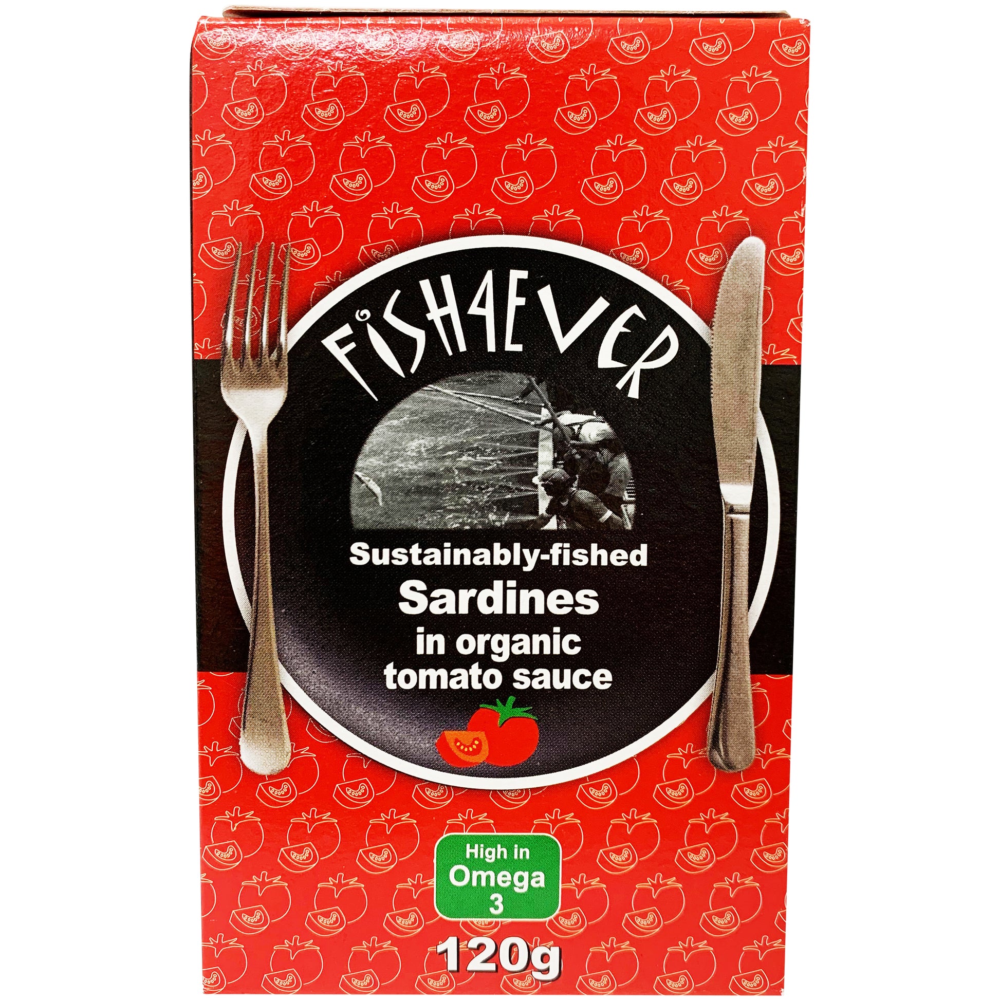 Fish4Ever Sardines in Organic Tomato Sauce 120g: Enjoy the rich flavor of sustainably sourced sardines in a delicious organic tomato sauce. Packed with omega-3 fatty acids and protein, this convenient and nutritious meal is perfect for a quick and healthy lunch or snack. Elevate your meals with the natural goodness of Fish4Ever Sardines.