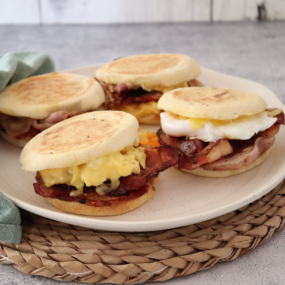 4. Spread some butter on each half of the muffins, build the muffins by placing the bacon, egg and cheese.