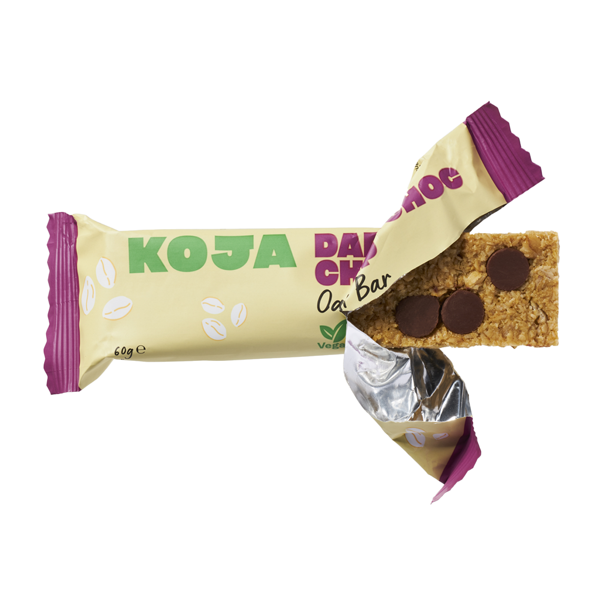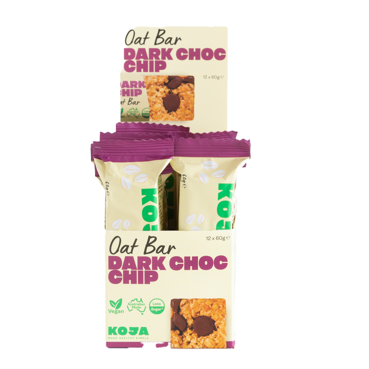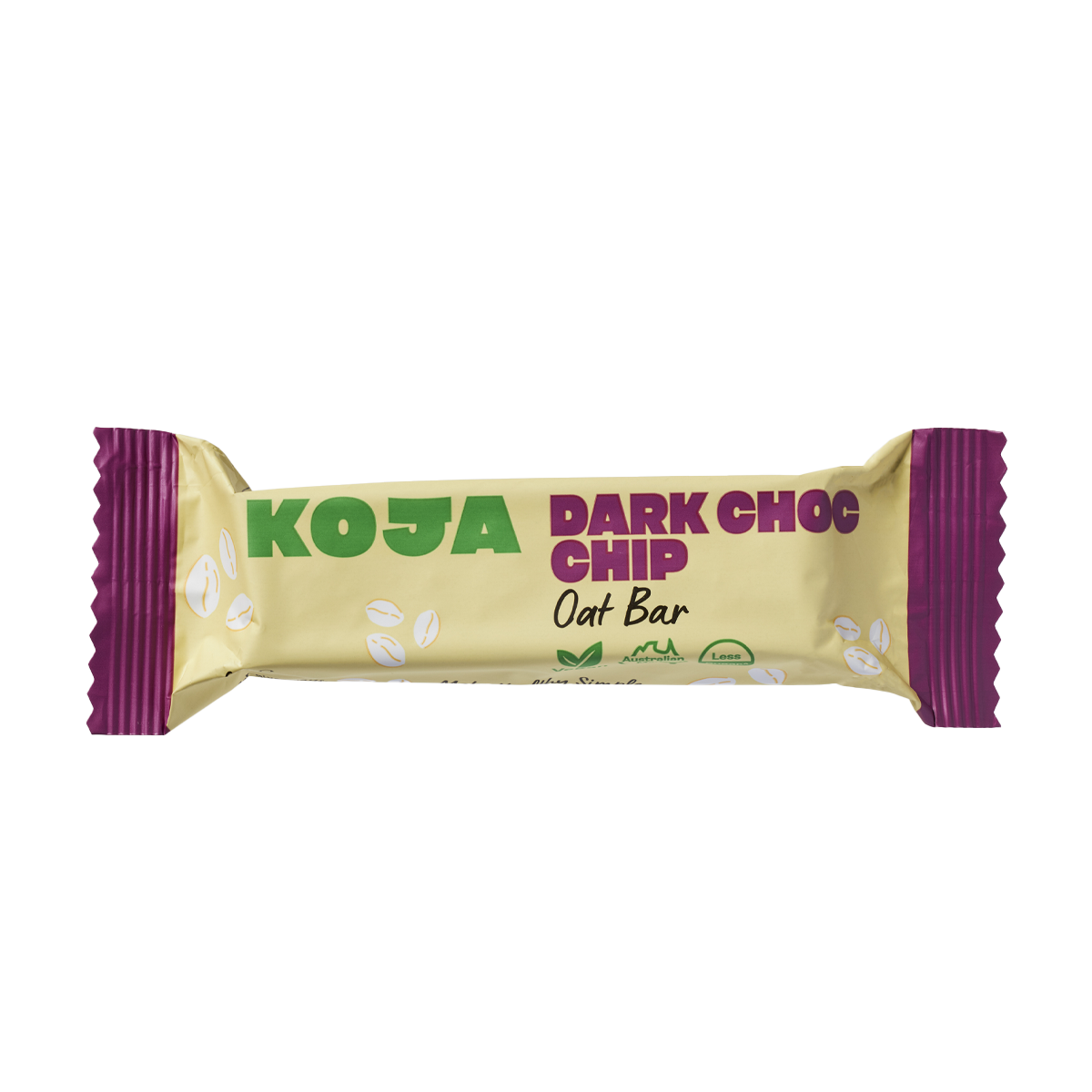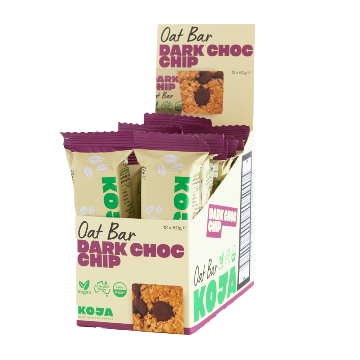 Koja Oat Bar Dark Choc Chip 60g: Indulge guilt-free with our deliciously satisfying oat bar packed with rich dark chocolate chips. Fuel your day with a wholesome snack that's high in fiber and protein, perfect for on-the-go energy.