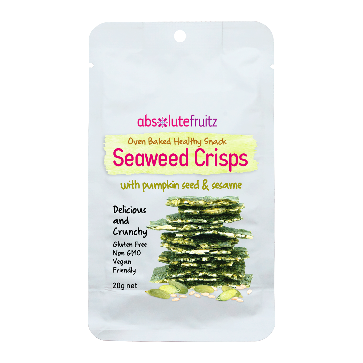 Absolutefruitz Seaweed Crisps with Pumpkin 20g: Indulge guilt-free with our crispy, savory snack packed with antioxidants and vitamins. Satisfy your cravings with a healthy twist!