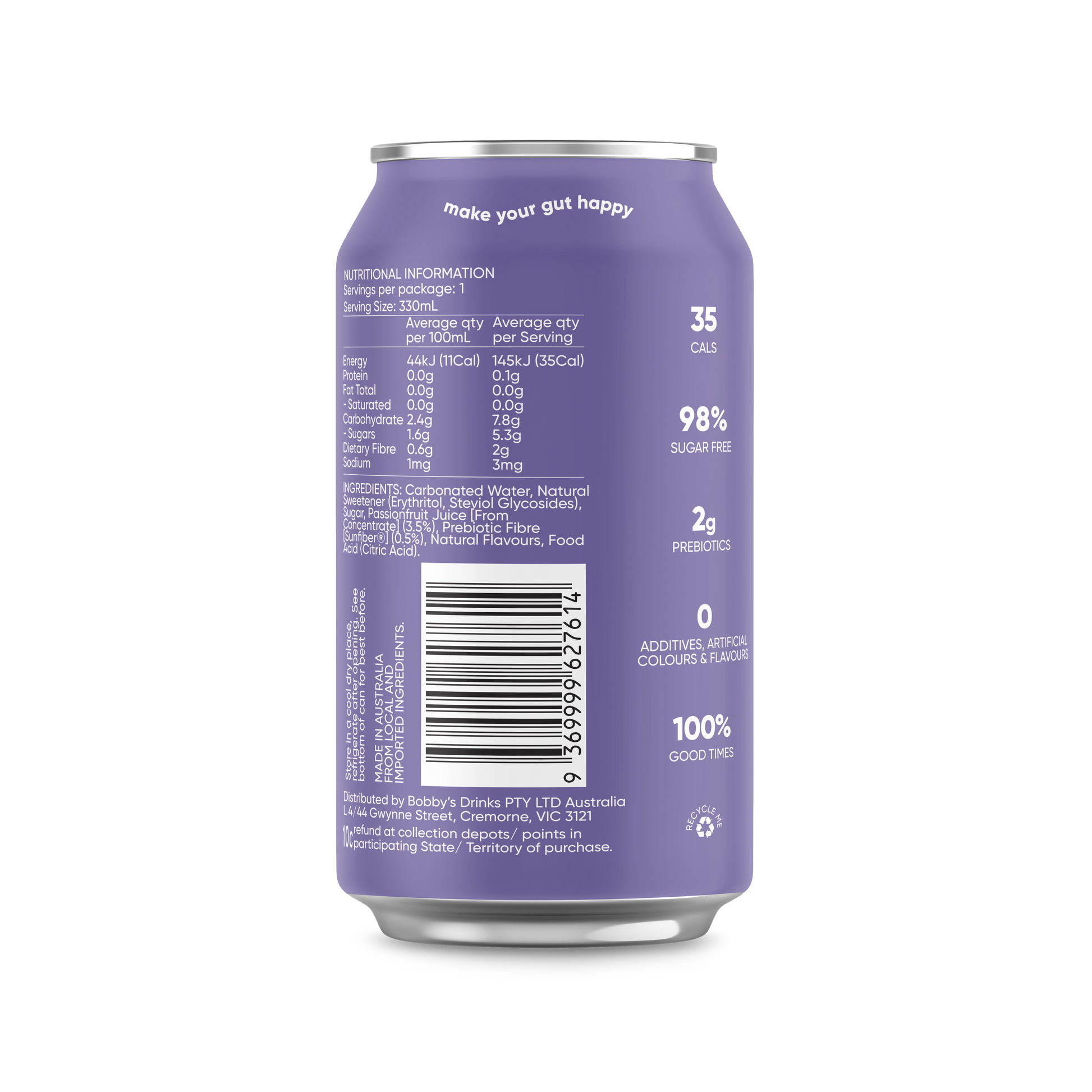 Bobby Prebiotic Soft Drink Passionfruit 330mL: Boost gut health with every sip of our deliciously refreshing passionfruit drink. Packed with prebiotics to support digestion and immunity, this guilt-free beverage is the perfect way to nourish your body and tantalize your taste buds. Try Bobby Prebiotic today for a flavorful way to care for your health.