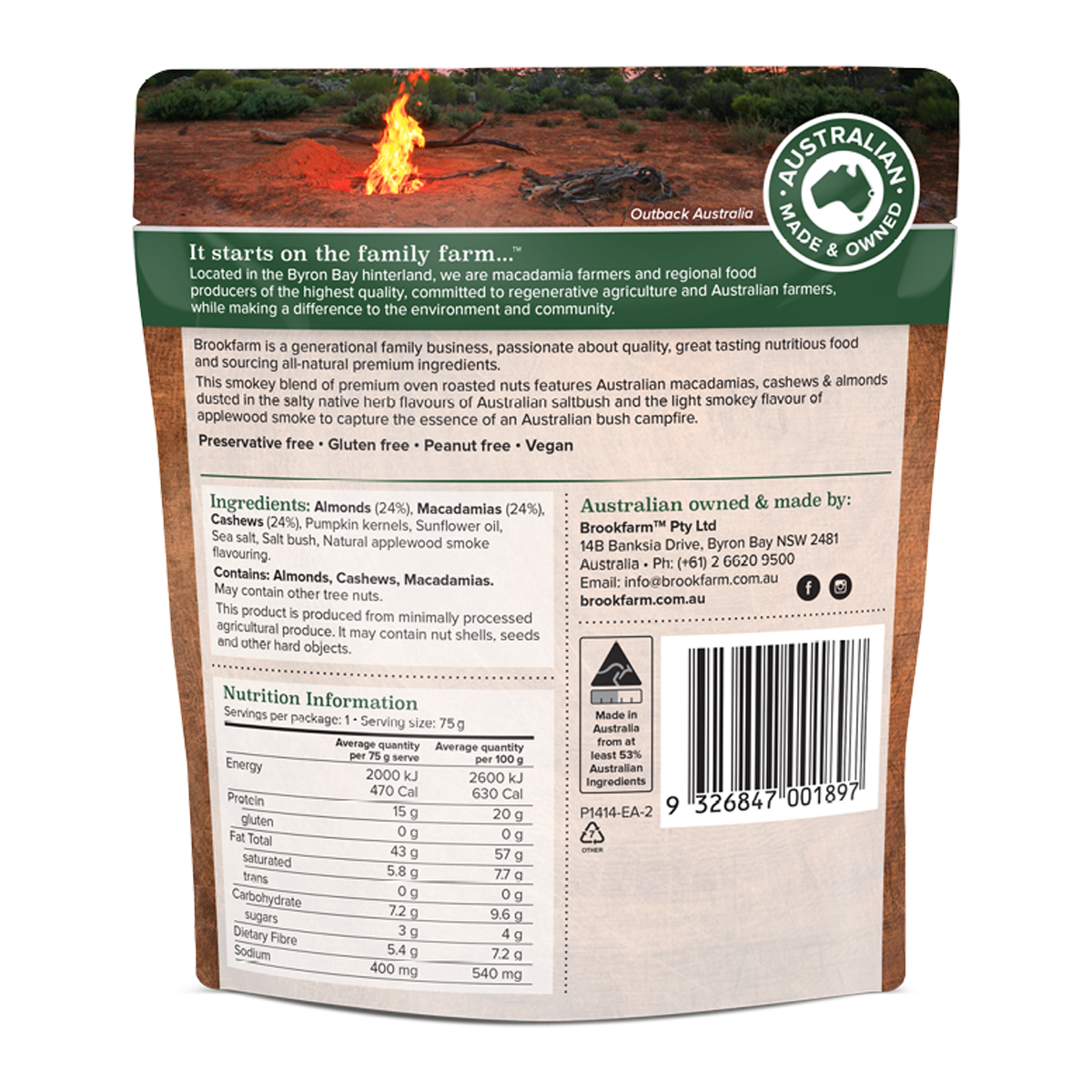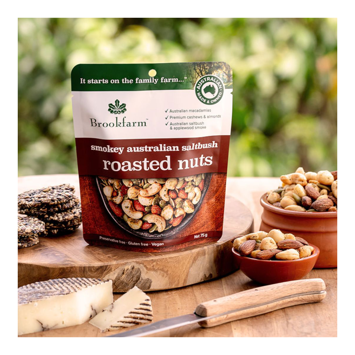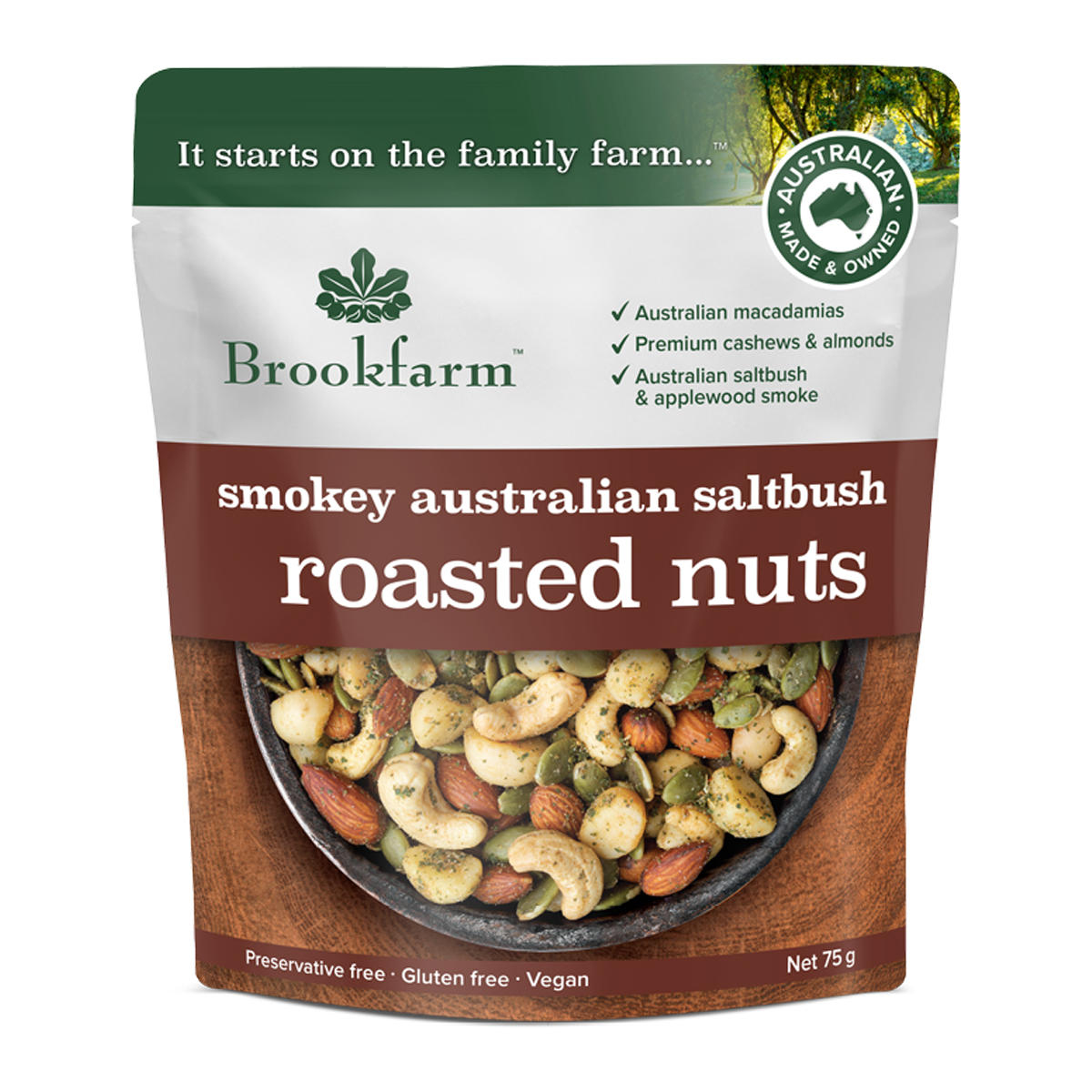 Enjoy the rich, smoky flavor of Brookfarm Roasted Nuts with Australian Saltbush. Packed with nutrients and irresistible taste, these nuts are the perfect snack for any time of day. Experience the unique blend of flavors in every bite.