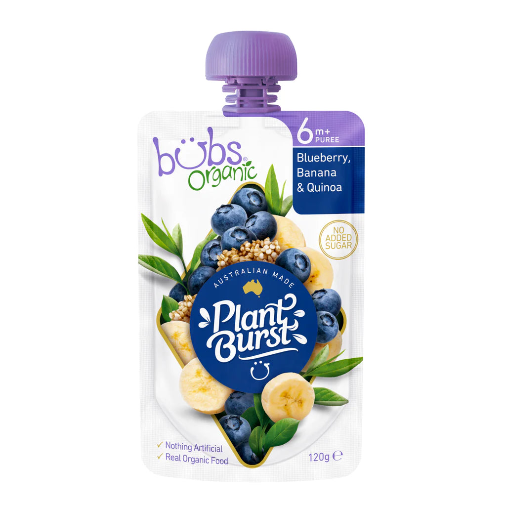 Bubs Organic Puree Blueberry, Banana and Quinoa is a nutritious and delicious choice for your baby's first foods. Packed with antioxidants, vitamins, and minerals, this organic puree supports your baby's growth and development. Suitable for babies 6 months and older, this convenient 120g pouch is perfect for on-the-go feeding. Give your little one the best with Bubs Organic Puree Blueberry, Banana and Quinoa.