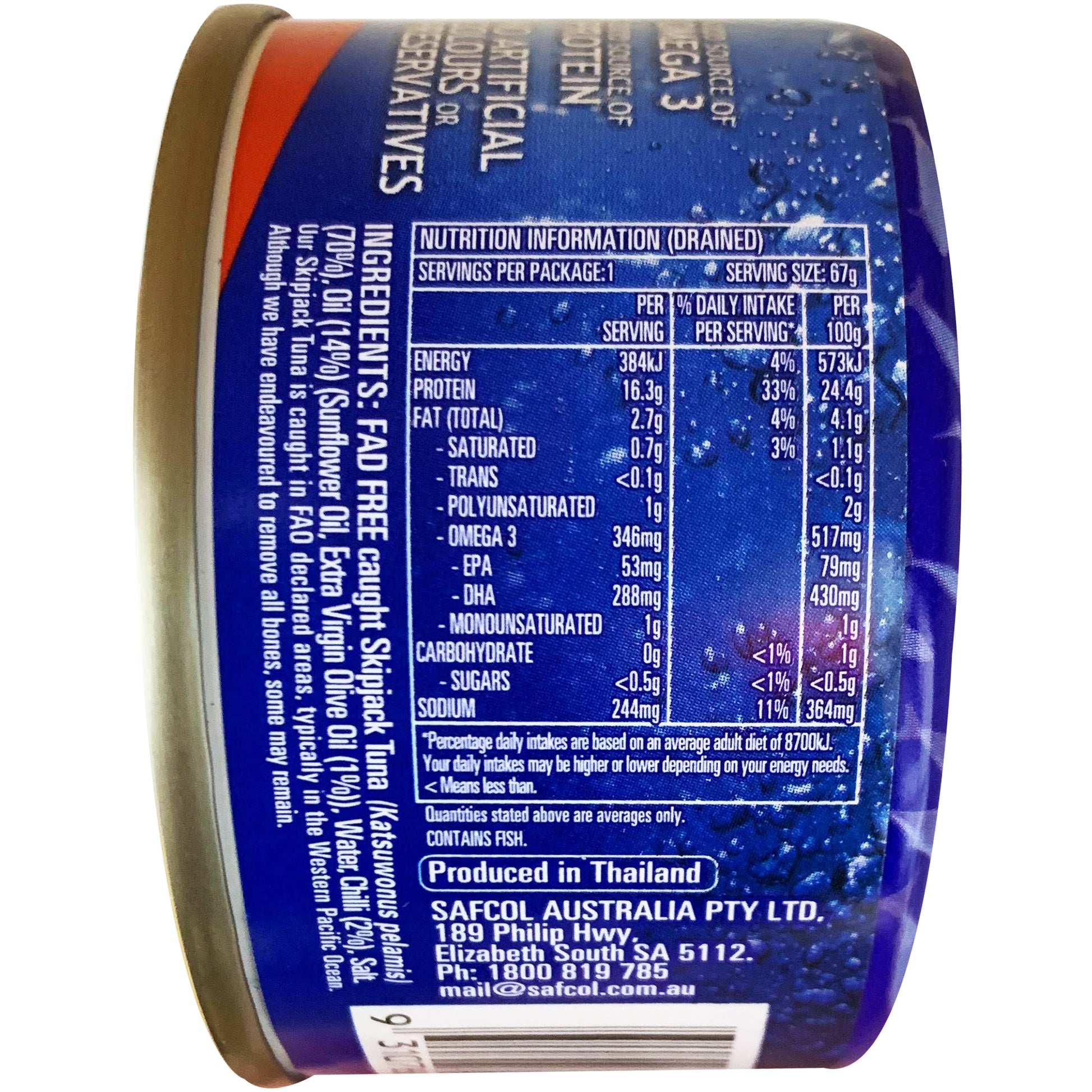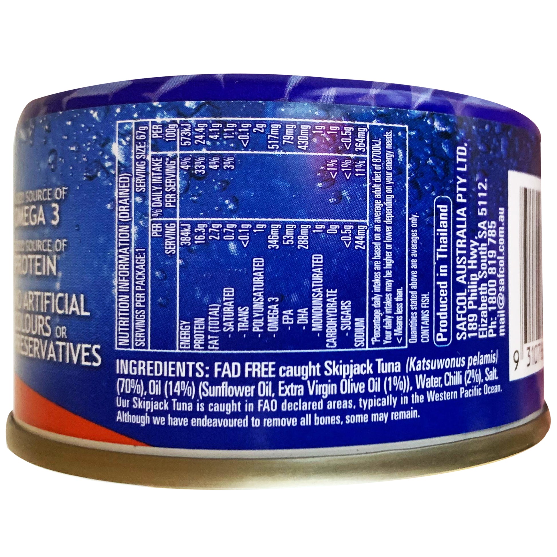 Safcol Tuna In Oil Blend with Chilli 95g offers a delicious and convenient way to add a spicy kick to your meals. Packed with high-quality tuna and infused with flavorful chili, this product is perfect for quick and easy meal preparation. Enjoy the benefits of a protein-rich and flavorful dish with Safcol Tuna In Oil Blend with Chilli 95g.