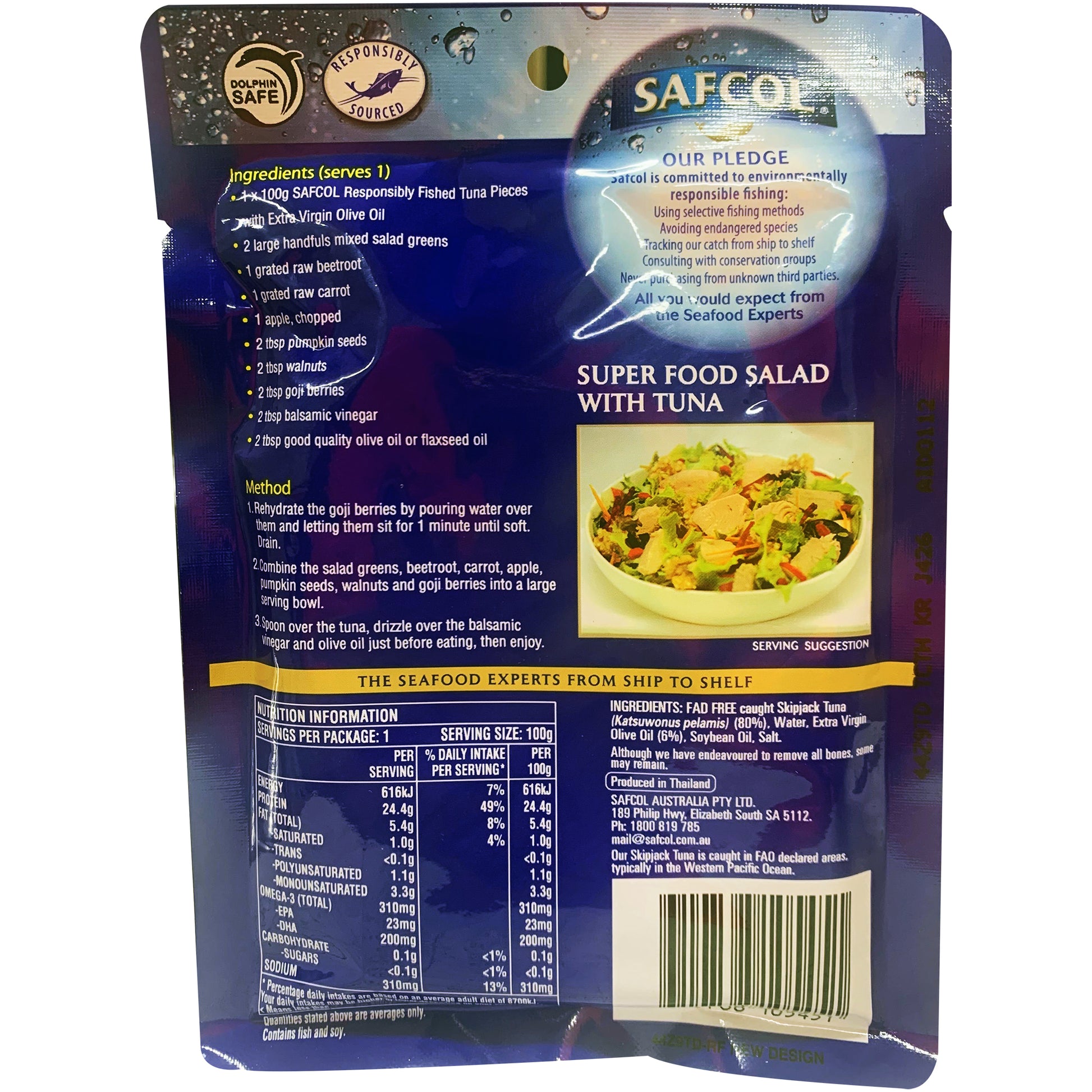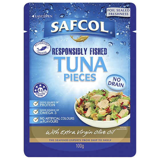 Safcol Tuna Pieces in Extra Virgin Olive Oil 100g: Premium quality tuna packed in heart-healthy olive oil for a delicious and nutritious meal. Enjoy the convenience of ready-to-eat tuna that is rich in omega-3 fatty acids and protein. Perfect for salads, sandwiches, or straight out of the can. Elevate your meals with Safcol Tuna Pieces in Extra Virgin Olive Oil.