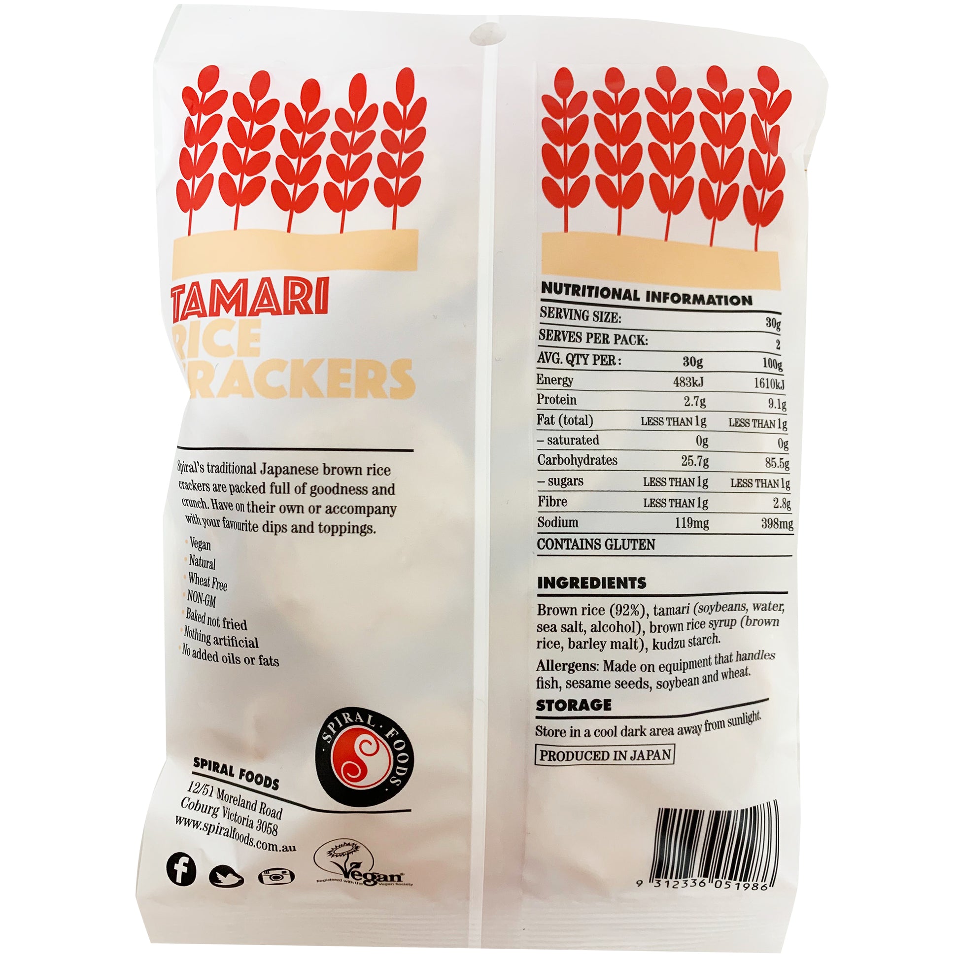 Spiral Foods Tamari Rice Crackers 65g: Delicious gluten-free snack with a savory tamari flavor. Perfect for on-the-go snacking or pairing with your favorite dips. Enjoy a guilt-free treat packed with authentic Japanese taste.