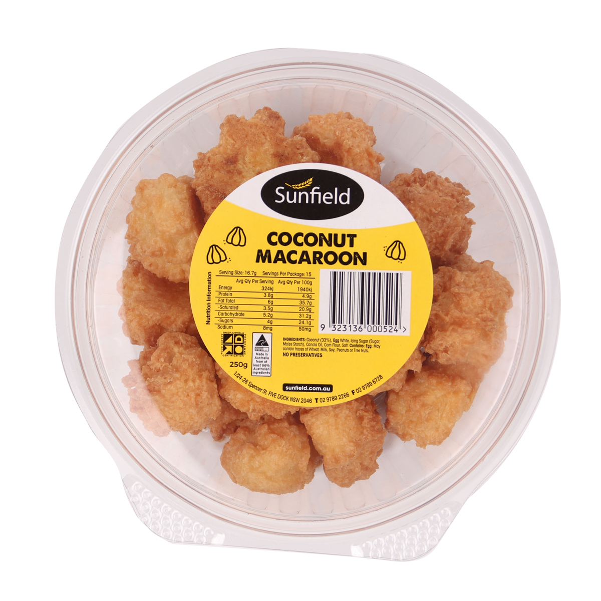 Indulge in the rich and tropical flavor of Sunfield Coconut Macaroon 280g. Made with real coconut, these delicious treats are perfect for satisfying your sweet cravings. Enjoy a taste of paradise with every bite!