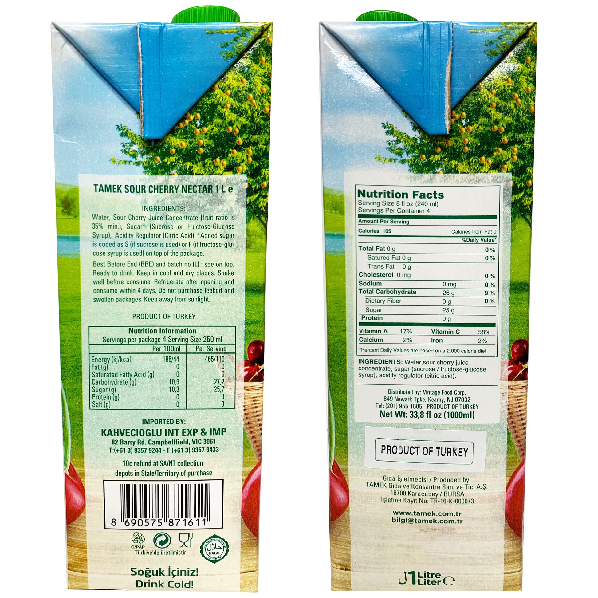 Tamek Sour Cherry Nectar Juice 1L: Indulge in the rich, tangy flavor of real sour cherries with every sip. Packed with antioxidants and vitamins, this refreshing juice is a delicious way to boost your immune system and support overall health. Enjoy the taste of summer all year round with Tamek Sour Cherry Nectar Juice.